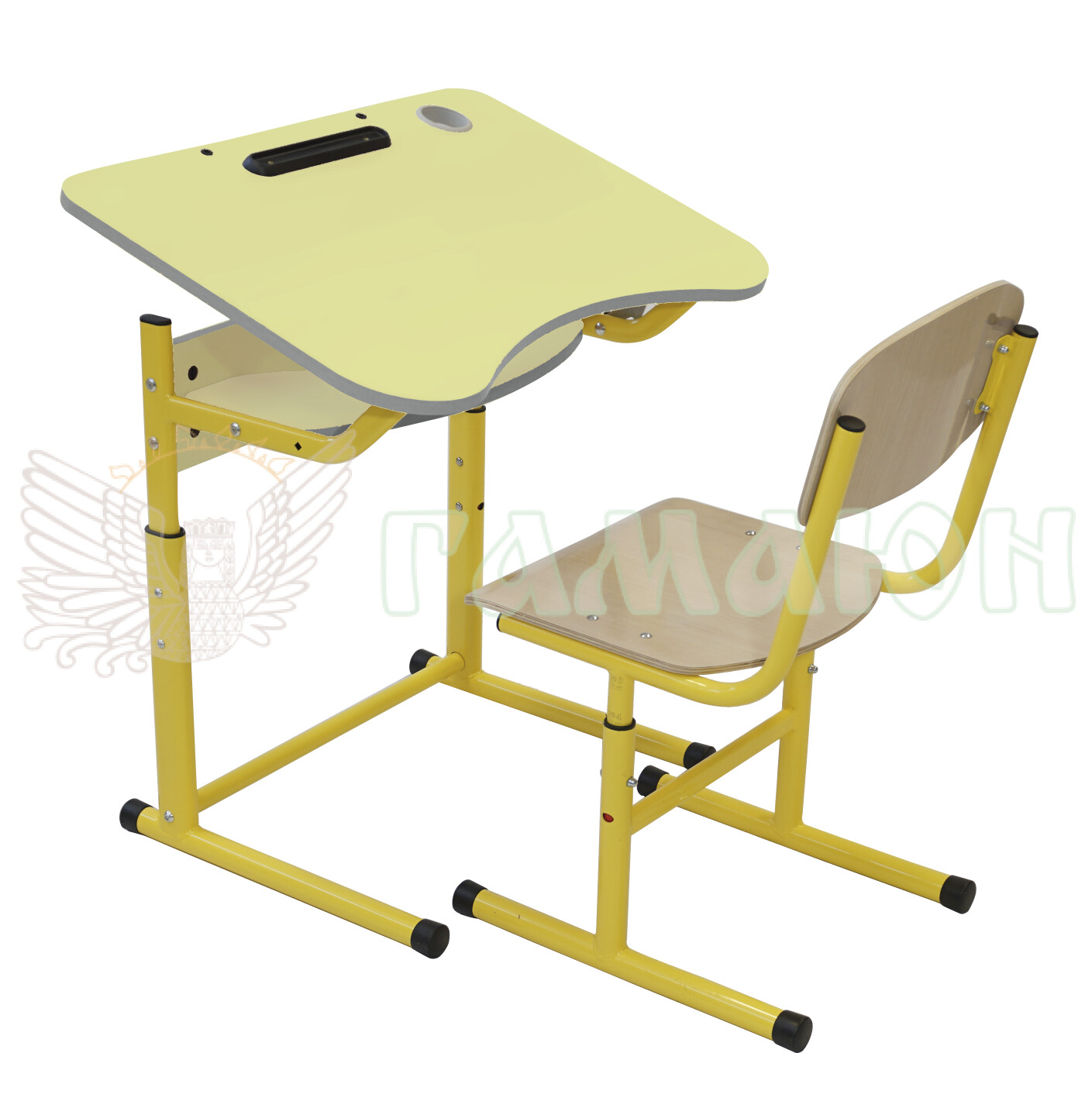 Комплект стіл учнівський 1-місний з полицею та регулюванням кута нахилу стільниці на комбінованому каркасі + Стілець Т-подібний, регульований по висоті на комбінованому каркасі, 3-6 ростові групи