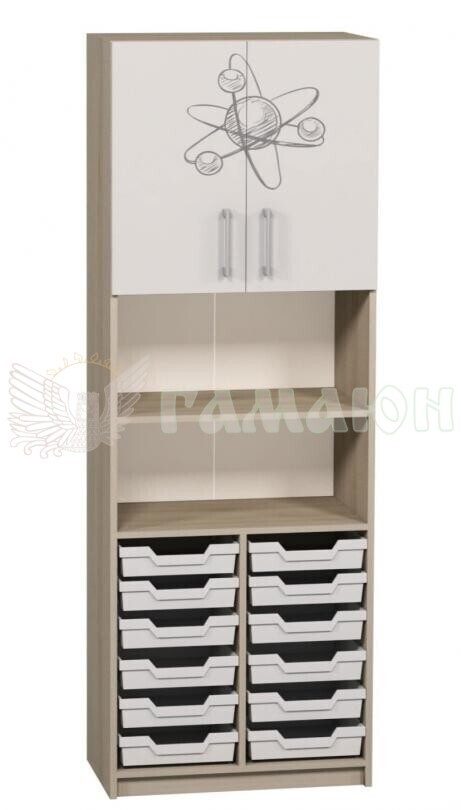 Опис виробу: Шафа призначена для організації зберігання навчального приладдя, дидактичних матеріалів або персональних речей у навчальних кабінетах, ресурсних кімнатах та адміністративних приміщеннях. Комбінована конструкція з відкритими й закритими секціями забезпечує швидкий доступ до потрібного вмісту та водночас охайний вигляд простору. Доповнення у вигляді лотків покращує сортування матеріалів і спрощує щоденну організацію. Фасад може бути оздоблений фотодруком, відповідно до стилю інтер'єру або навчального простору.