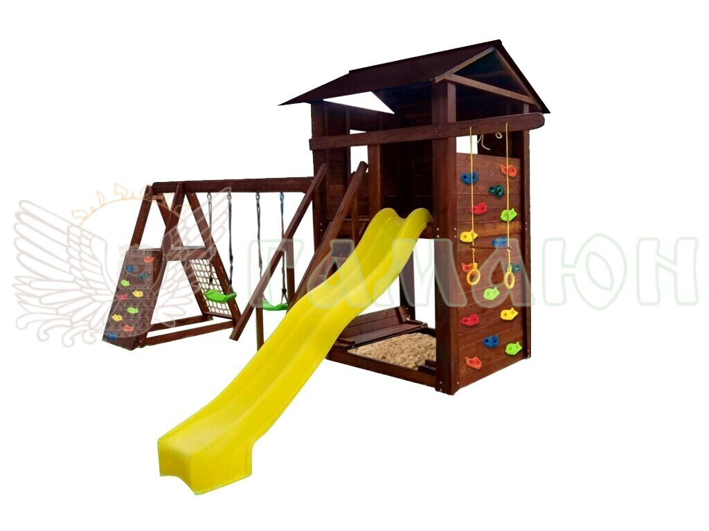 Ігровий будиночок, Пісочниця, Сходи з поручнями, Скелелазка - 2шт., Гірка пластикова - 1шт., Гойдалки 2 пластикові, Кільця - 1 пара, Канат - 1шт.