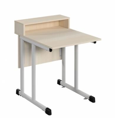 Всі елементи столу виготовляються з ДСП кольору “бук” товщиною 16 мм класу емісії Е1. Під стільницею розміщено дві шухляди на металевих роликових направляючих. Стіл обладнано тумбою з дверцятами та відкритою нішею з двома полицями. Спереду він закритий екраном.