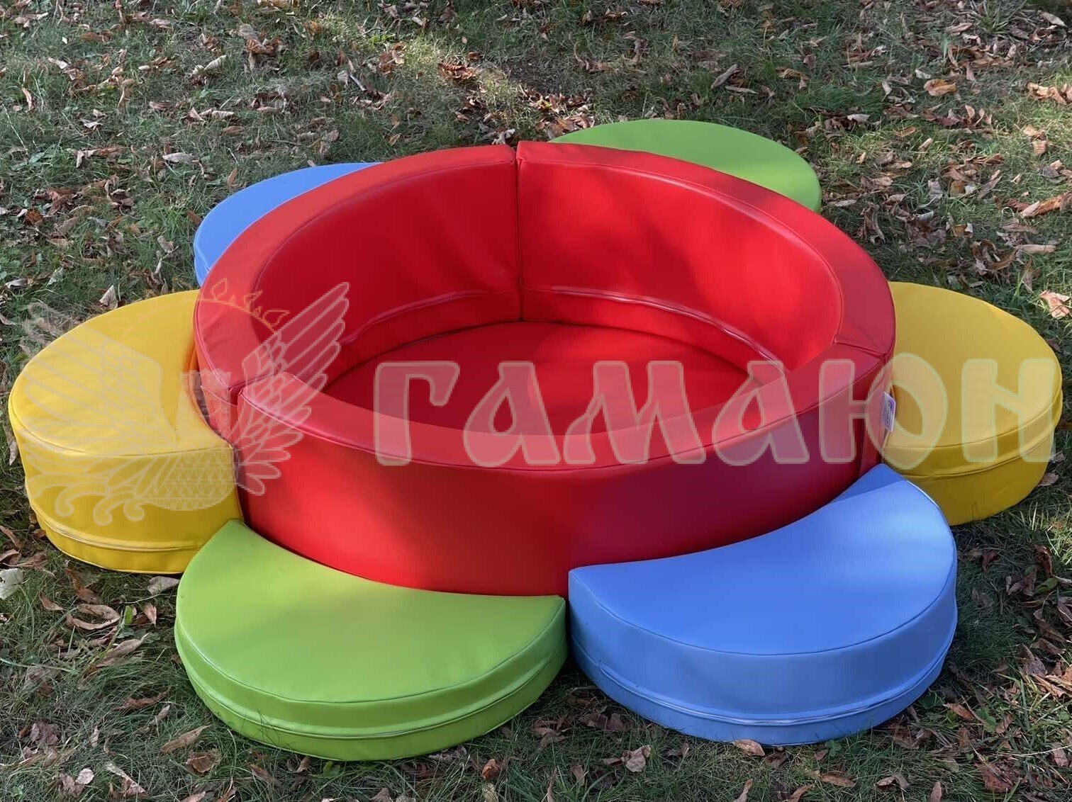 Сухий басейн «Пелюстки» являє собою конструкцію круглої форми, яка складається з дна і товстих м'яких стінок, які з'єднуються липучками. Також басейн доповнений пелюстками, що можуть служити як сходинками для допомоги малюку потрапити в басейн, так і окремими пуфами. У нього можна насипати пластикові кульки, м'які іграшки та ін.