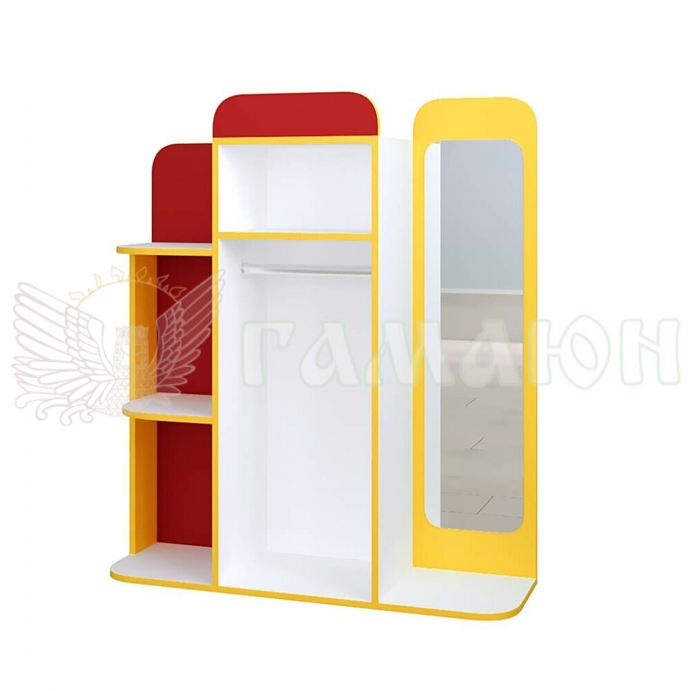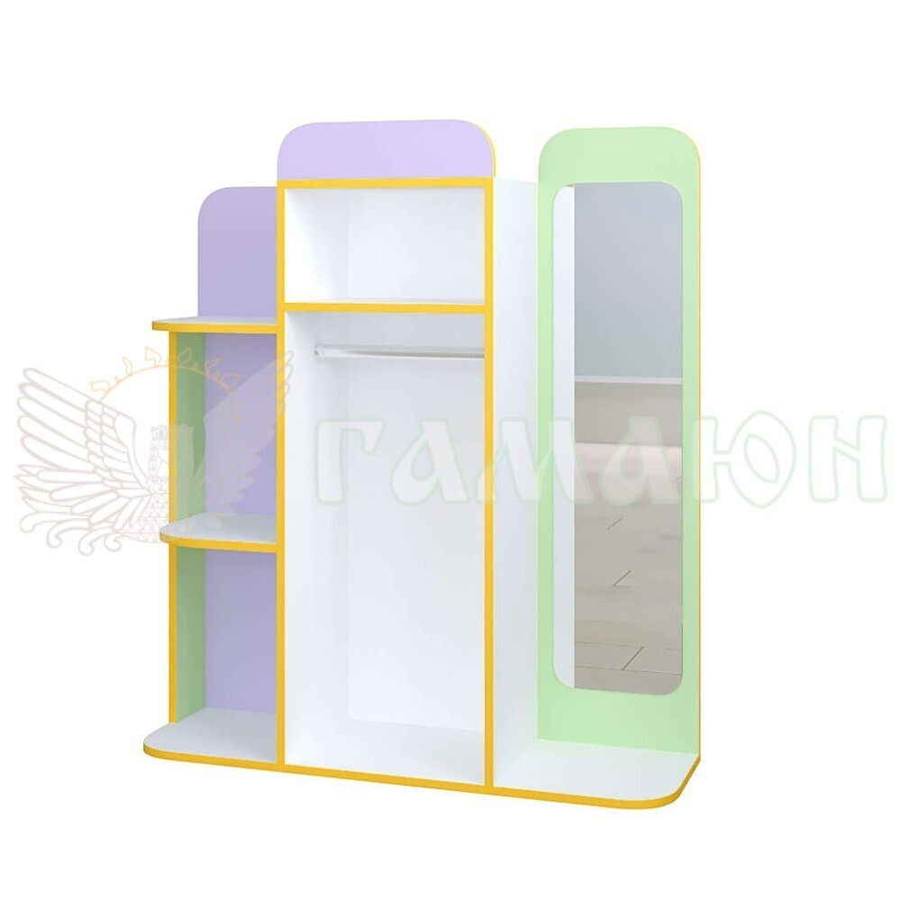 Ігрові меблі призначені для обладнання дитячого садка. Комплект є імпровізованою роздягальню з іграшковою шафкою для одягу, дзеркалом і поличками. Меблі виготовлені з екологічно чистої ДСП товщиною 16 мм класу Е1, призначеної для виготовлення дитячих меблів. На торці нанесена кромка ПВХ товщиною 0,6 мм при високотемпературному режимі на кромкооблицювальному верстаті, що забезпечує максимальний захист країв від вологи та механічних пошкоджень. Базовий колір кромки – жовтий. Основні деталі корпусу за замовчуванням виготовлені з ламінованої ДСП білого, жовтого та зеленого кольору, за бажання можна додати ДСП синього або червоного кольору без подорожчання меблів. Також дані кольору можна замінити будь-який інший колір ДСП. У цьому випадку вартість розраховуватиметься індивідуально. Усі матеріали підтверджені сертифікатом якості.