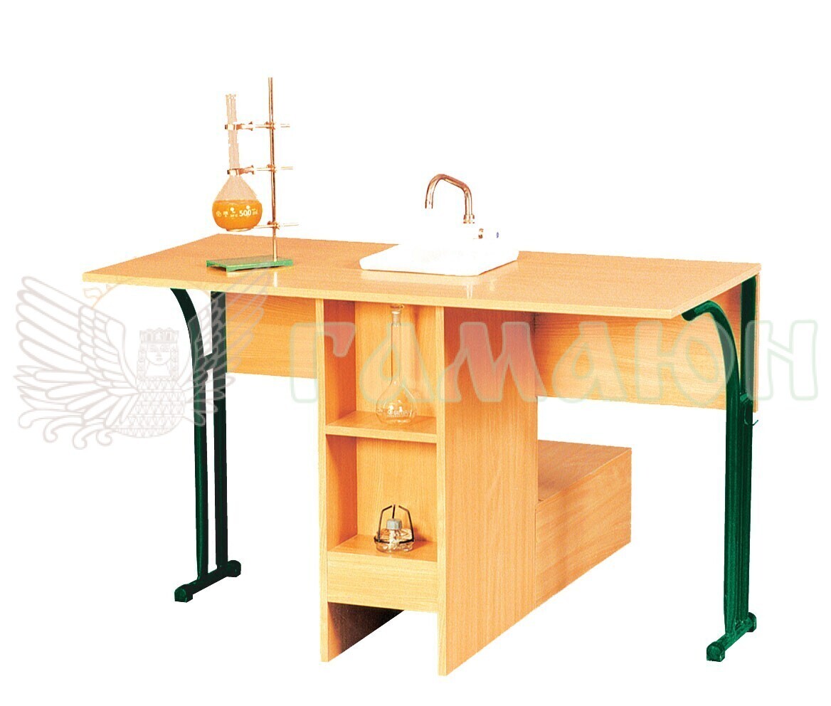 Опис виробу: Стіл призначений для виконання хімічних експериментів, демонстрацій і практичних занять в умовах шкільних лабораторій. Оснащення мийкою зі змішувачем забезпечує зручність роботи з реагентами та лабораторним посудом. Конструкція передбачає наявність відкритої полиці та переднього екрану для ергономічного зберігання допоміжного приладдя і візуального закриття простору під стільницею. Виріб зібрано на зварному металевому каркасі, що гарантує міцність і стійкість при тривалій експлуатації.