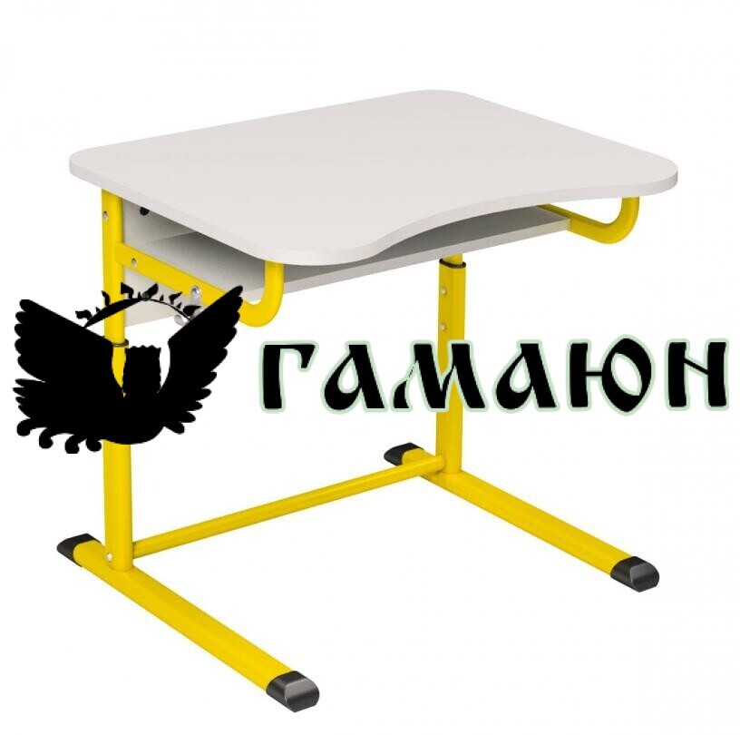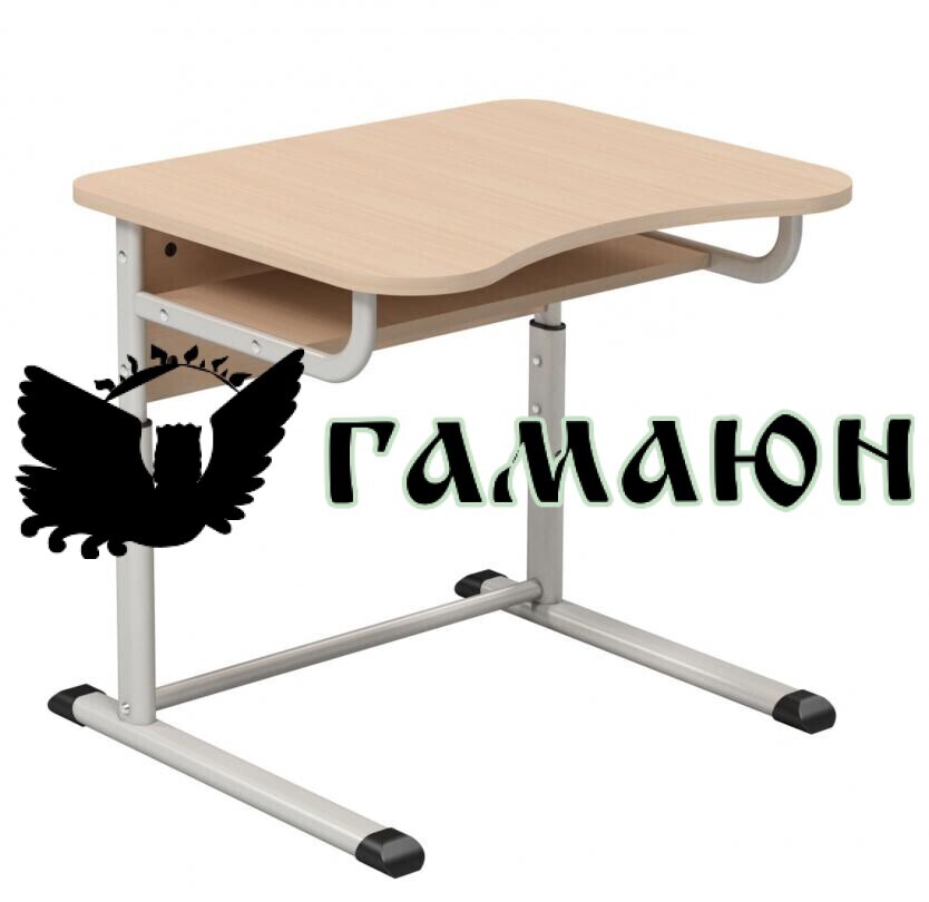 Опис виробу: Стіл призначений для індивідуального робочого місця учня у класах загальної та спеціалізованої освіти. Модель оснащена ергономічною стільницею без нахилу, що зручно для письма, малювання та роботи з ноутбуком. Конструкція каркасу передбачає наявність полиці та декоративного екрану між опорами, а також гачок для рюкзака або портфеля.