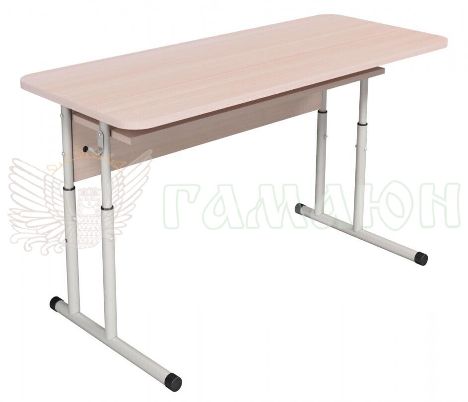 Каркас виготовлений з круглої металевої труби d25/d32 мм. Покриття наноситься напиленням порошкових полімерних матеріалів. Стільниця із заокругленими кутами, виготовлена із ламінованої ДСП товщиною 18 мм. ПВХ - 1 мм. Екран та полиця виготовлені з ламінованої ДСП товщиною 16 мм. Регулювання висоти здійснюється за рахунок наскрізної гвинтово-гайочної стяжки із фіксацією ковпачкової гайки у трубі. На каркасі присутнє маркування ростових груп при регулюванні висоти столу.