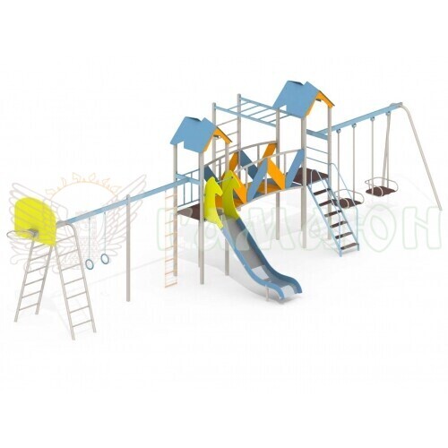 Складається з: Майданчик з дахом 2 шт., Гірка 1 шт., Сходи 1 шт., Огорожа 1шт., Рукохід 1 шт., Шведська стінка 3 шт., Гойдалки подвійні 1 шт., Гімнастичні кільця 1 к-т., Баскетбольне кільце 1 шт., Сходи мотузкові 1 шт., Місток 1 шт.
