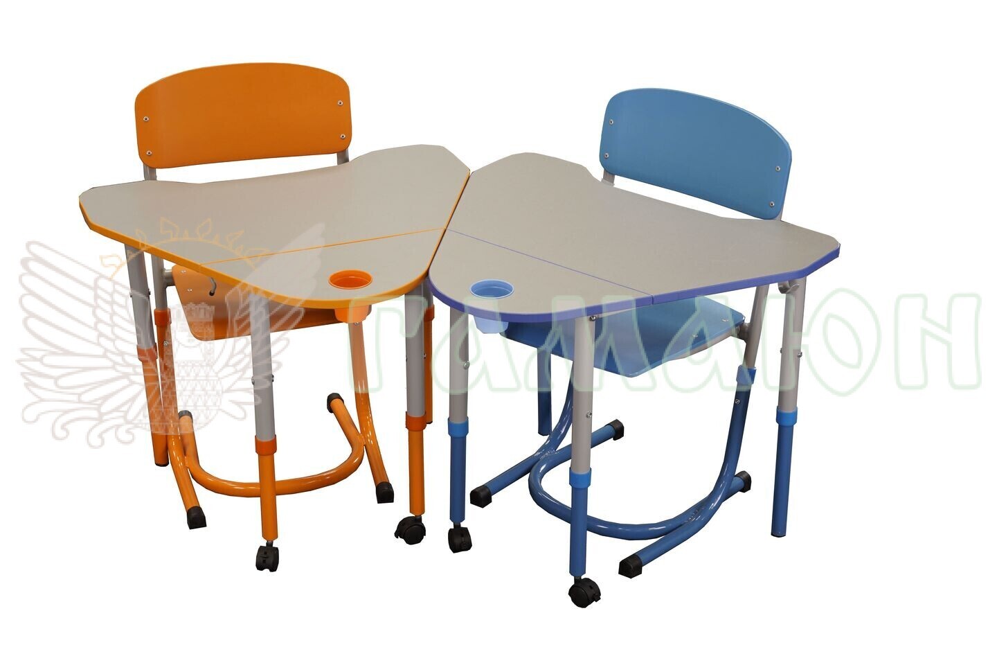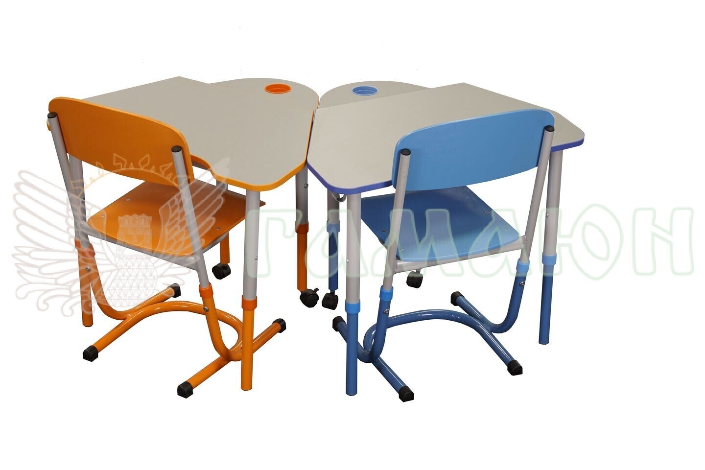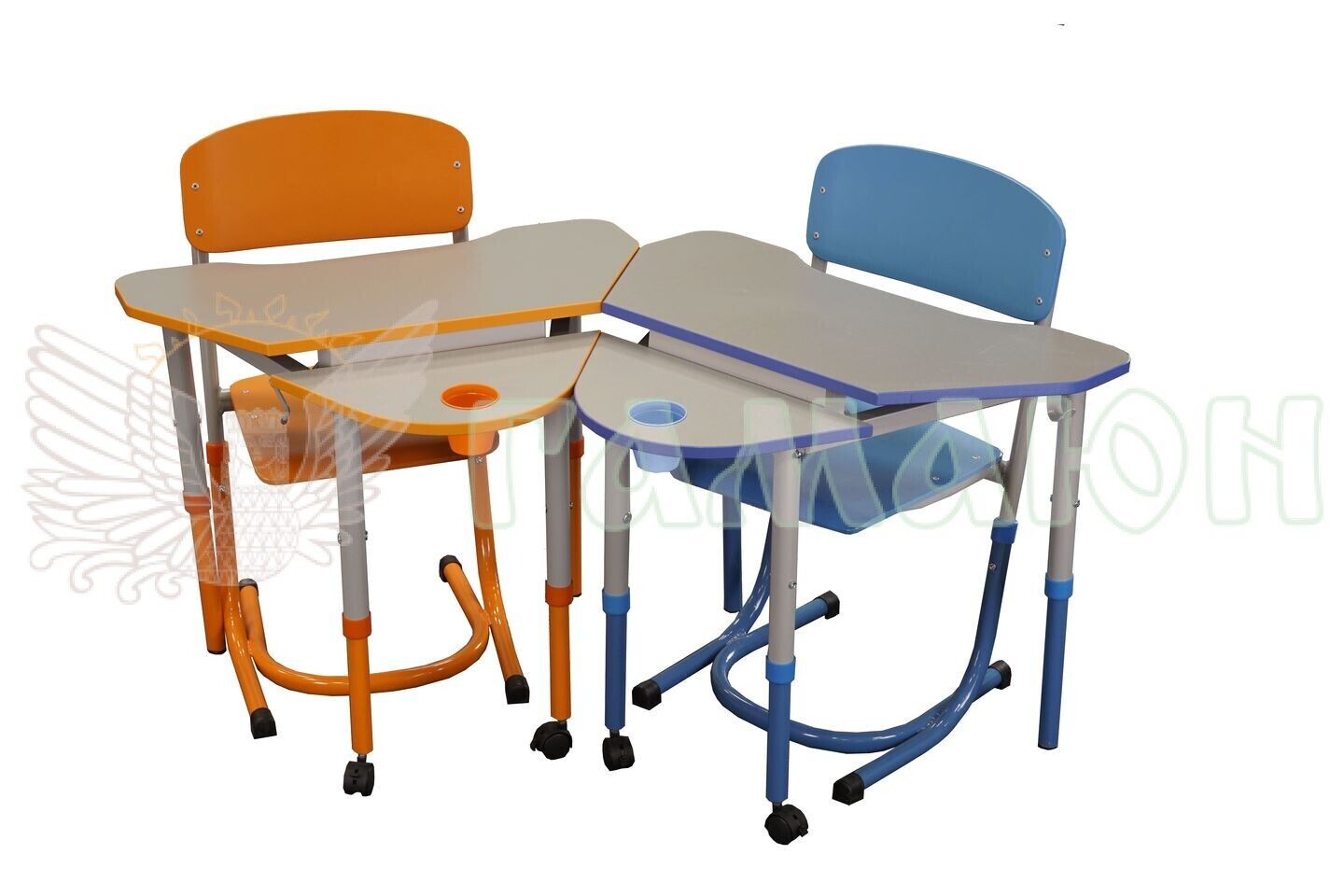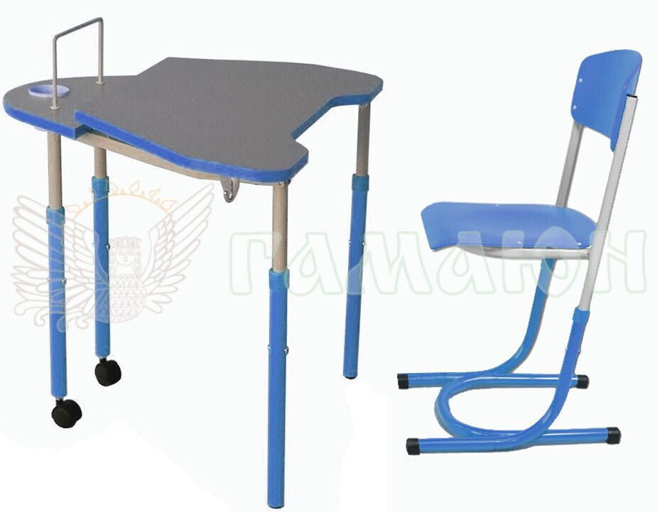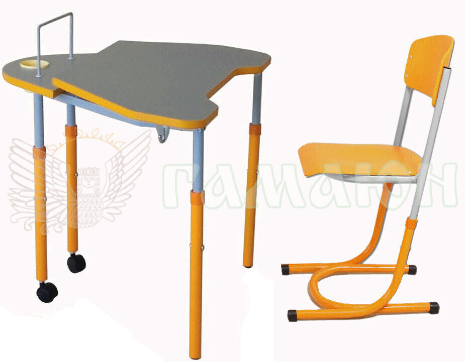 Стіл складається з металевого цільнозварного каркасу та двоелементної стільниці. Стільниця складається з двох частин – рухомої та нерухомої. На нерухомій частині встановлюється «стаканчик» для канцелярських приладь. У верхній частині каркасу стола кріпиться гачок для портфеля. Регулювання стола по висоті здійснюється за допомогою гвинтових стяжок та рухомих, по відношенню одна до одної, деталей каркасу.