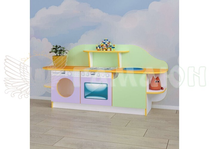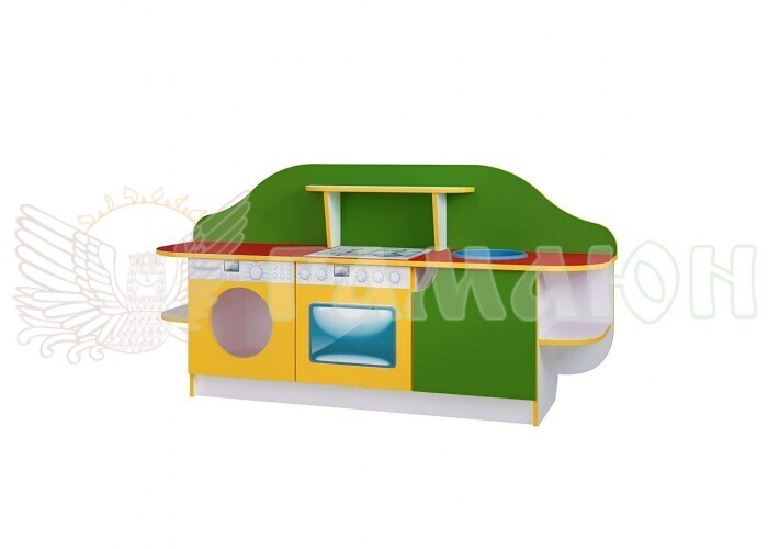Ігрові меблі призначені для обладнання дитячого садка. Комплект є імпровізованою кухнею з іграшковою мийкою, пічкою і пральною машиною. Меблі виготовлені з екологічно чистої ДСП товщиною 16 мм класу Е1, призначеної для виготовлення дитячих меблів. На торці нанесена кромка ПВХ товщиною 0,6 мм при високотемпературному режимі на кромкооблицювальному верстаті, що забезпечує максимальний захист країв від вологи та механічних пошкоджень. Базовий колір кромки – жовтий.