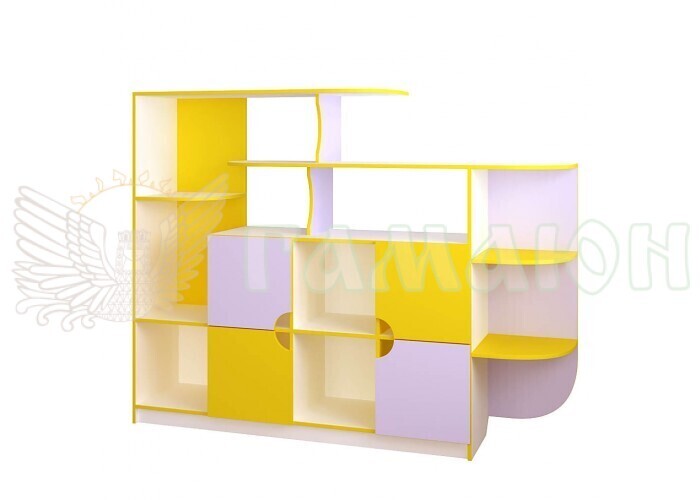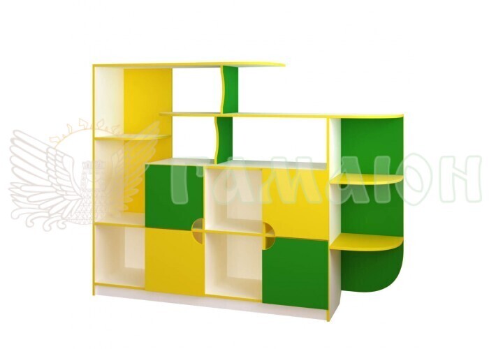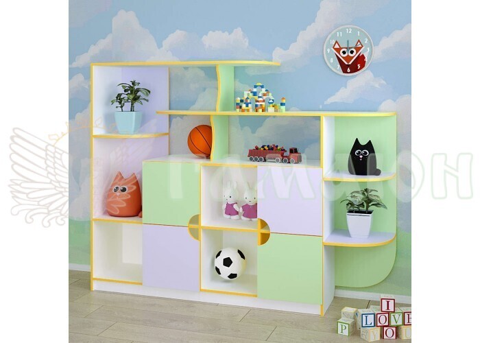 Дитяча стінка призначена для обладнання дитячого садка.. Є містким набором закритих секцій і відкритих полиць для іграшок. Меблі виготовлені з екологічно чистої ДСП товщиною 16 мм класу Е1, призначеної для виготовлення дитячих меблів. На торці нанесена крайка ПВХ товщиною 0,6 мм при високотемпературному режимі на кромкооблицювальному верстаті. Це забезпечує максимальний захист країв від вологи та механічних пошкоджень. Базовий колір крайки – жовтий. Основні деталі корпусу за замовчуванням виготовлені з ламінованої ДСП білого, жовтого та зеленого кольору, також можна використовувати ДСП синього та червоного кольору без подорожчання меблів. За бажанням дані кольору можна замінити будь-який інший колір ДСП. У цьому випадку вартість розраховуватиметься індивідуально. Усі матеріали підтверджені сертифікатом якості.