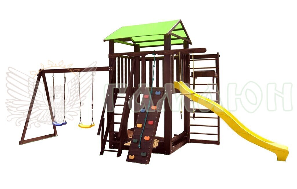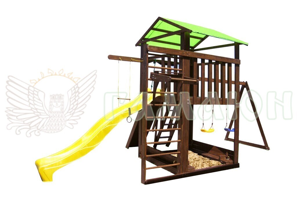 Ігровий будиночок, Пісочниця з кришкою, Скелелазка, Шведська стінка, Турнік-Бруси, Гірка пластикова, Гойдалки 2 пластикові, Кільця, Канат над Скелелазка