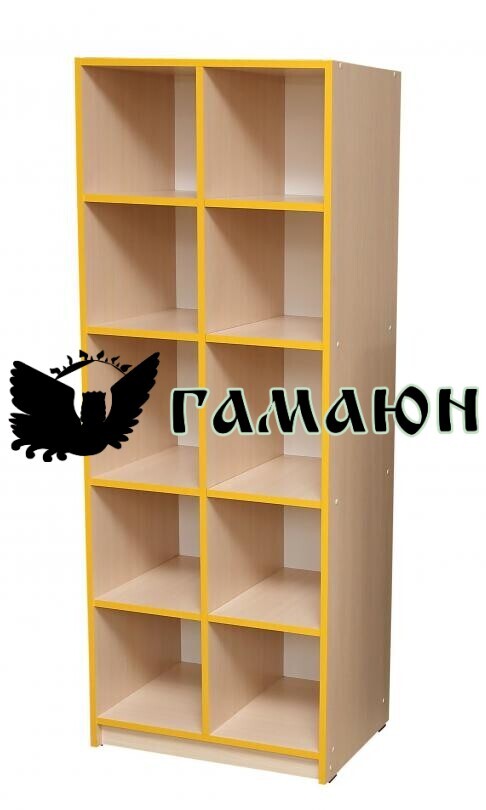 Стелаж відкритий з 10-ма комірками. Виготовлений з ДСП 16 мм. Задня стінка виготовлена з білої ламінованої ДВП товщиною 3 мм.