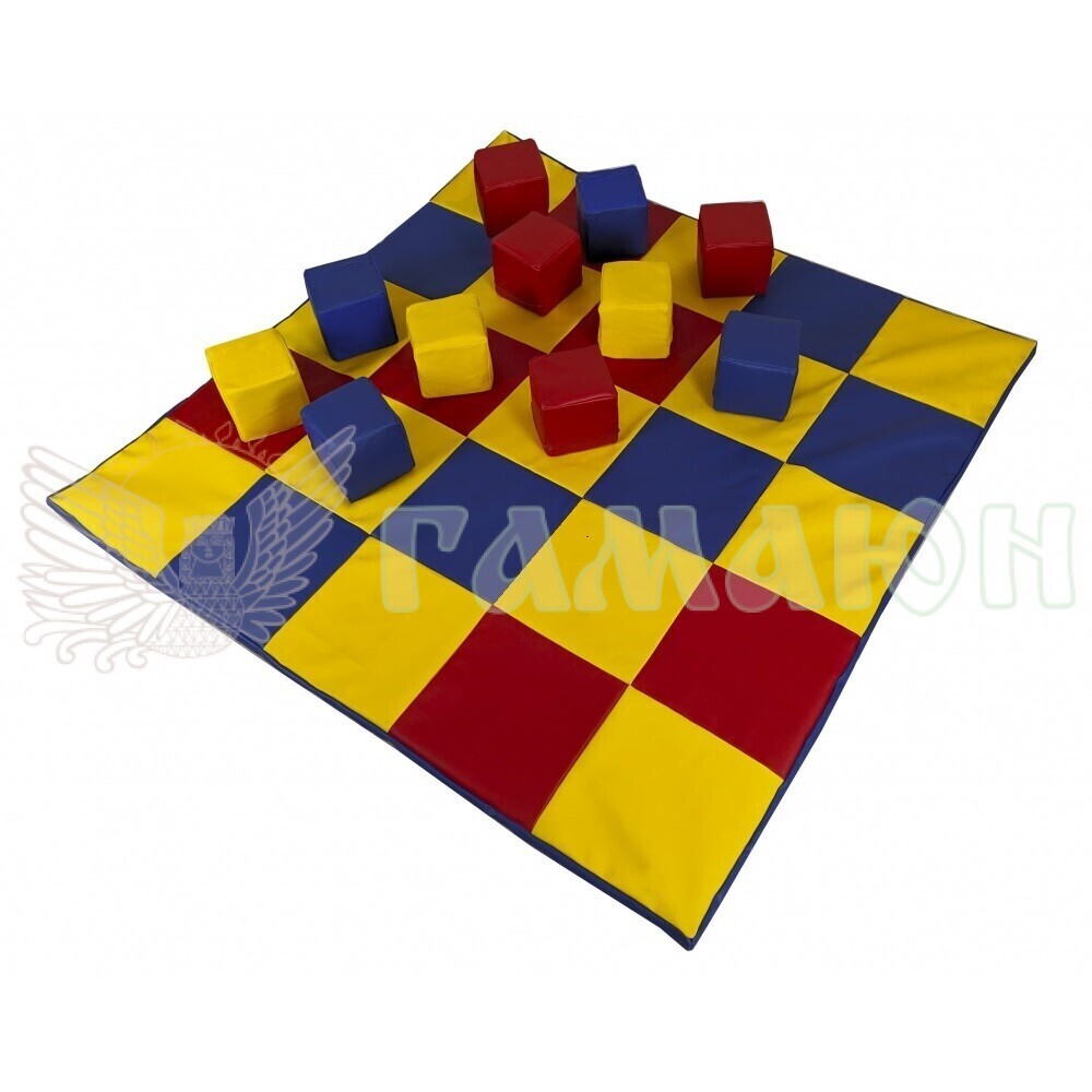 Мат-килимок міцний, м'який, компактний, легко миється і чиститься. Мат і кубики мають знімний чохол. Матеріал чохла - шкірозамінник, наповнювач - пінополіуретан. У комплекті - 10 шт. кубиків.