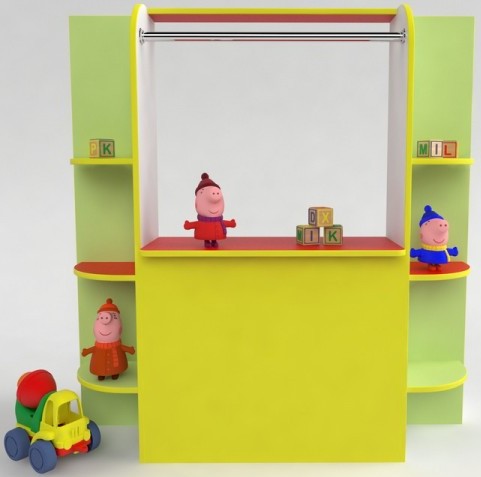 Ігрові меблі призначені для обладнання дитячого садка. Комплект є імпровізованою кухнею, в яку входить пральна машина, грубка, мікрохвильова піч і мийка. Меблі виготовлені з екологічно чистої ДСП товщиною 16 мм класу Е1, призначеної для виготовлення дитячих меблів. На торці нанесена кромка ПВХ товщиною 0,6 мм при високотемпературному режимі на кромкооблицювальному верстаті, що забезпечує максимальний захист країв від вологи та механічних пошкоджень. Базовий колір кромки – жовтий.