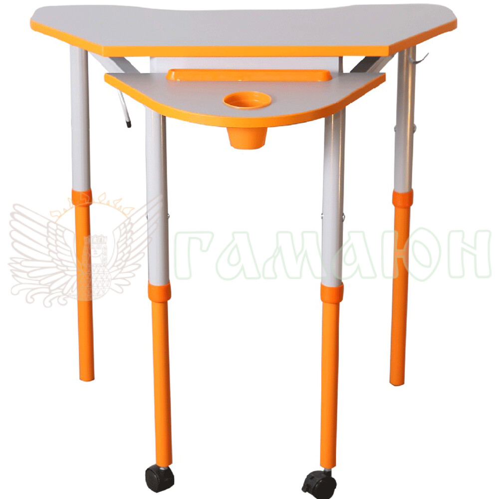 Каркас стола виконаний з труб 25х25х1,2; ϕ.27х1,2 та ϕ.32х1,2 для зростових груп 3-5 або 4-6. Стіл має 4 ноги-опори – дві передні оснащені роликами, за допомогою яких стіл може легко переміщатися по приміщенню. Регулювання стола по висоті здійснюється за допомогою гвинтових стяжок та рухомих, по відношенню одна до одної, деталей каркасу. Рухомі деталі каркасу з’єднані через пластикову втулку. На каркасі стола встановлений механізм підйому стільниці, що дозволяє їй займати два положення 0⁰ та 8⁰.