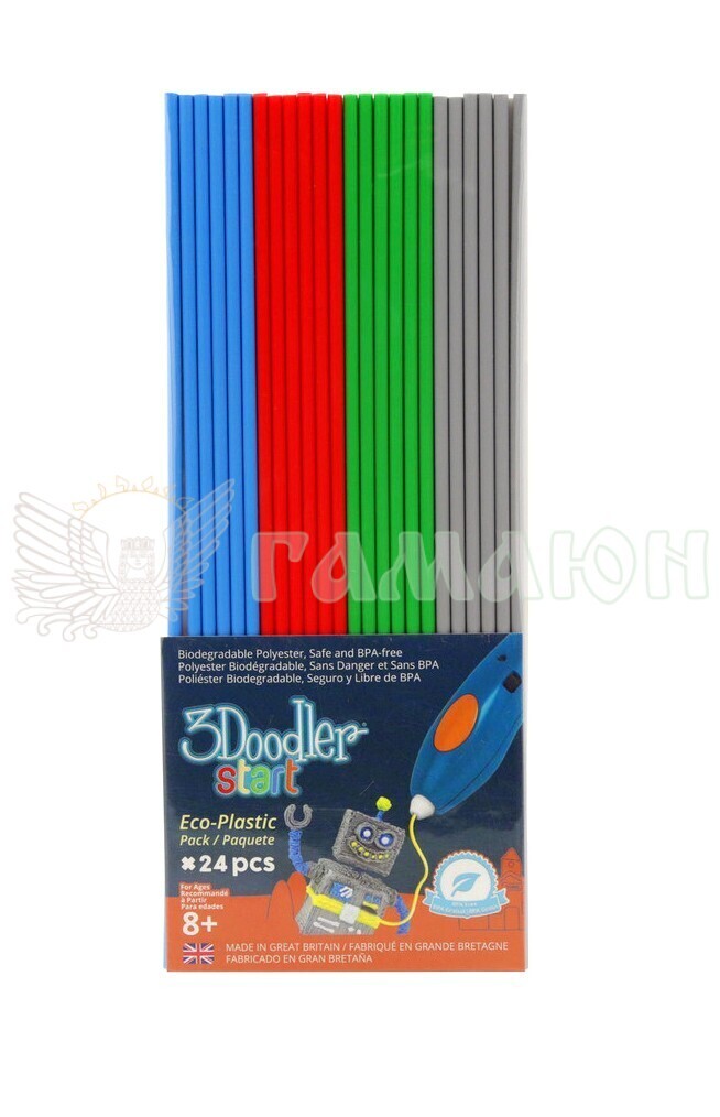 Стержні виготовлені з харчових безпечних нетоксичних матеріалів, які повністю біорозкладаються протягом 45 днів при контакті з грунтом. щоб уникнути опіків. Протягом 20 секунд матеріал залишається пластичним, дозволяючи підправити готовий виріб. Абсолютно безпечний при попаданні до рота. Не залишає слідів у разі потрапляння на одяг. У наборі:24 стрижні сірого, блакитного, зеленого та червоного кольорів Цей набір підходить тільки для 3D-ручки 3Doodler Start.