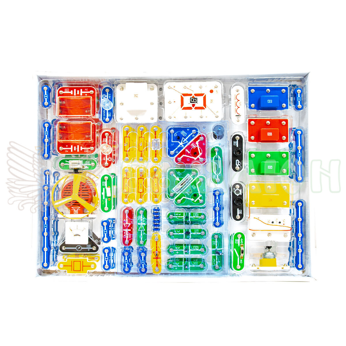 Конструктор складається з наступних елементів:1. Сполучні дроти.2. П'єзовипромінювач.3. Сенсорна пластина.4. Геркон (магнітокерований контакт) з магнітом.5. Кнопковий вимикач. 7. Вимикач. 8. Фоторезистор. 9. Червоний світлодіод. Лампа 2.5.10. Кріпильні тримачі для батарейок.11. Динамік.12. Інтегральна схема музична.13. Інтегральна схема сигнальна.14. Інтегральна схема "зоряні війни".15. Електромотор з пропелером.16. Антена.17. Зелений світлодіод.18. Лампа 6 В.19. Мікрофон.20. Інтегральна схема "підсилювач потужності".21. Резистори 100 Ом, 1 кОм, 5 кОм, 10 кОм, 100 кОм.22. Конденсатори 0.0 2мкф, 0.1 мкф, 10 мкф, 100 мкф, 470 мкф.23. Інтегральна схема "підсилювач високої частоти".24. PNP транзистор.25. NPN транзистор.26. Реостат.27. Інтегральна схема "FM діапазон". Необхідні батареї 4хАА. У набір також входить посібник, який містить ілюстрації – від простих до складних схем, – та 999 описів схем, які ви зможете легко зібрати. Електронний конструктор розвиває в дитині: дрібна моторика, увага, логіка, пам'ять, математичні поняття Електронний конструктор Знаток стане чудовим подарунком для хлопчиків 5 років.