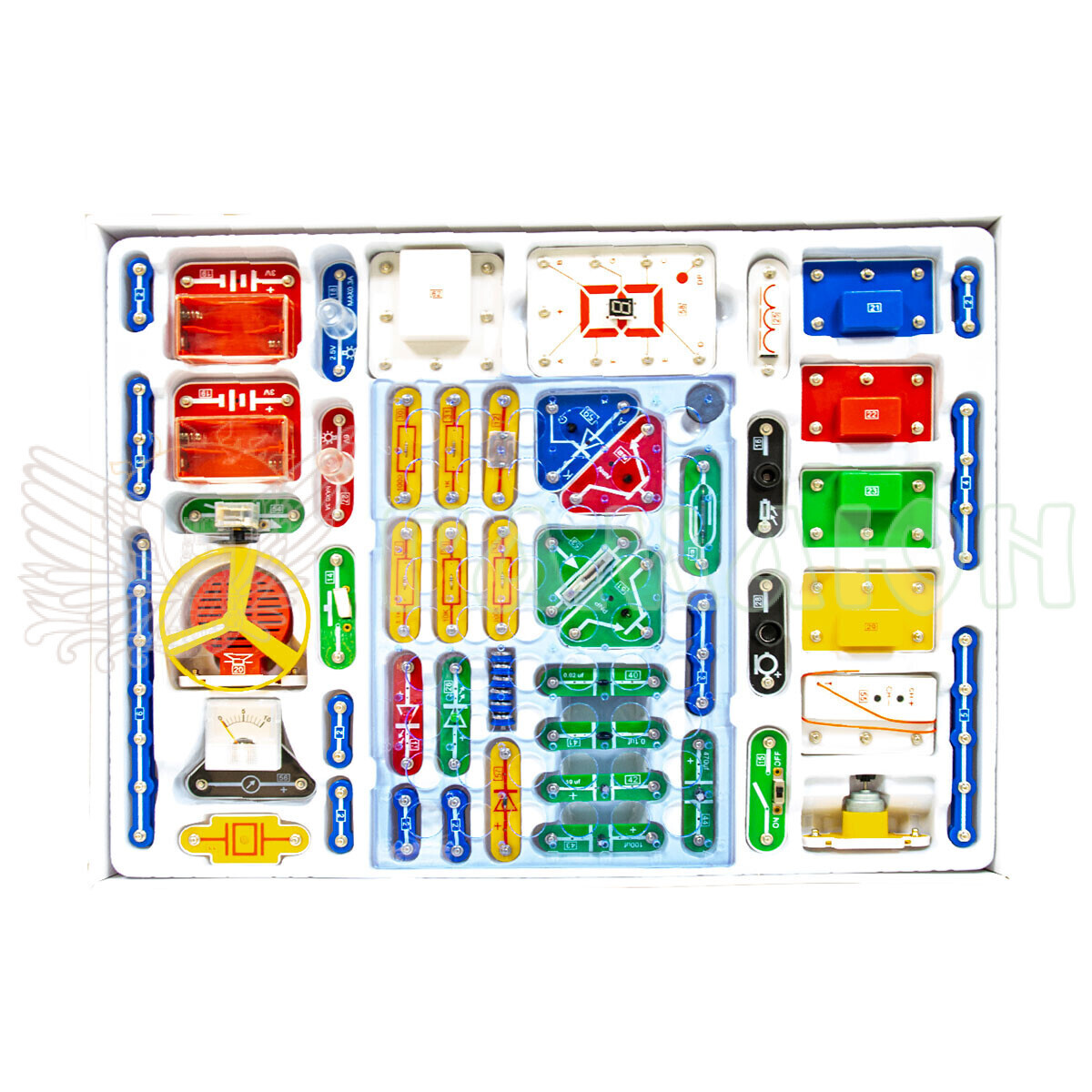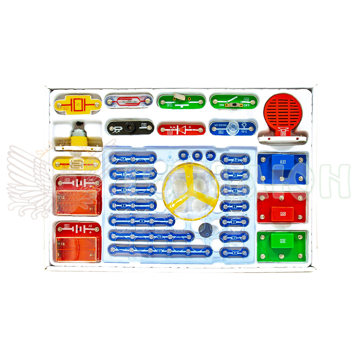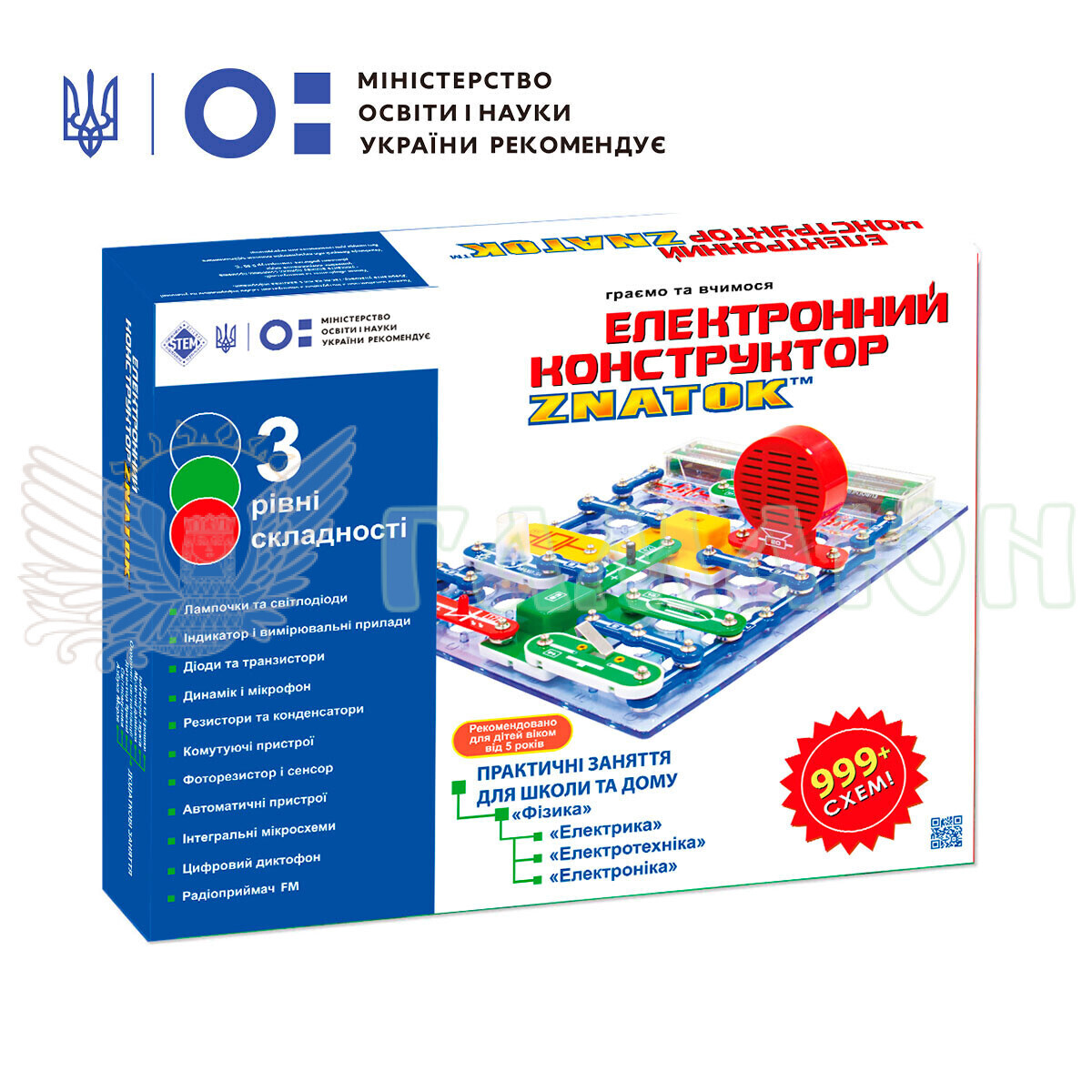 Конструктор Знаток Школа 999 схем+ – спеціальна версія електронного конструктора для освітніх установ, призначена для організації практичних занять з фізики у рамках вивчення курсу "Електрика". Наочно продемонструє принципи дії діода, транзистора, фоторезистора, радіоприймача та безлічі інших пристроїв та приладів. Керівництво навчально-практичної частини містить опис 21 практичного заняття для школи. Оригінальний спосіб з'єднання деталей забезпечує швидкий та ефективний результат без використання паяння. Конструктор пройшов апробацію у школах та інших дитячих закладах та отримав високу оцінку фахівців. Практичні заняття узгоджуються з існуючою шкільною програмою та підручниками фізики 8, 9, 10 та 11 класів. Завдання розбиті на 3 групи різного рівня складності: Синій - початковий рівень Зелений - середній рівень Червоний - рівень вище середнього За допомогою конструктора можна зібрати:1. Радіо FM — регулювання гучності, автоматичне налаштування станції.2. Вимірювальні схеми (вольтметр, амперметр) - 75 варіантів схем.3. Диктофон (запис/відтворення).4. Детектор брехні. Світловий індикатор — літери (малі та великі) та цифри.6. Автоматичні освітлювачі - "нагадувачка" про настання темряви, датчик дощу, ночник.7. Музичний дверний дзвінок з варіантами керування. Імітатори звуків - 12 варіантів, 120 варіантів схем.9. Охоронні сигналізації — звуки, що відлякують, звукова/світлова реакція на обрив дроту.10. Регульований метроном. У комплект входять 2 посібники, за допомогою якого можна зібрати понад тисячу електросхем, що дозволяють на практиці освоїти ази управління світлом, звуком, електрикою та водою. Категорії розвитку дитини: дрібна моторика, увага, логіка, пам'ять, математичні поняття. 4хАА. Рекомендовано для дітей віком 5 років.