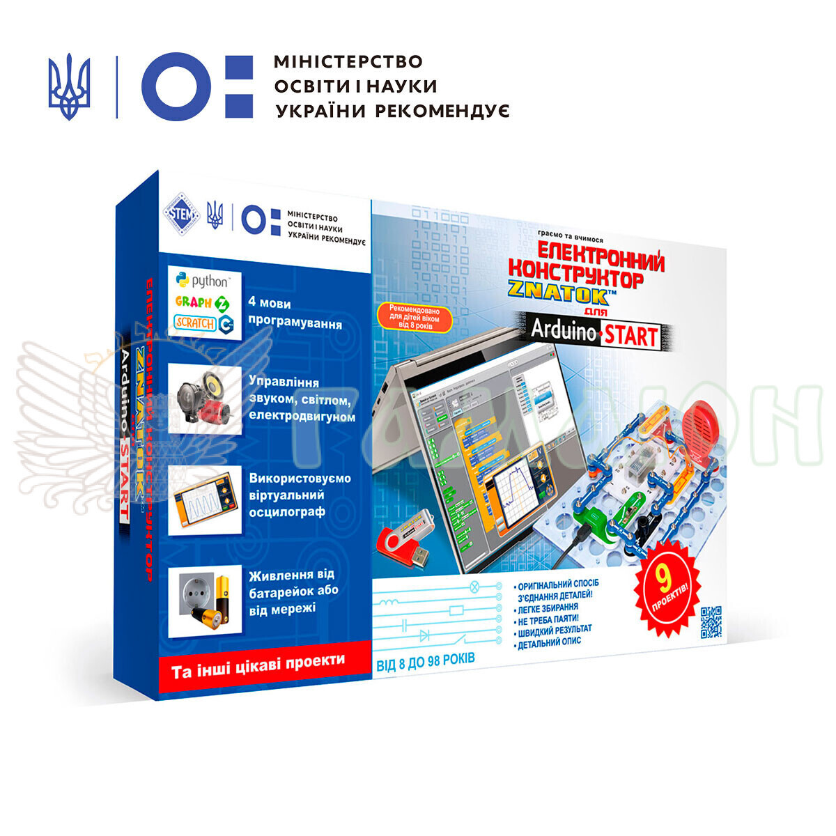 Смартфони, літаки, автомобілі, телевізори, пральні машини, холодильники і навіть сучасні праски мають у своєму складі мікроконтролери, які керують цією самою технікою та здійснюють зв'язок або з людиною, або з іншими приладами. Не кажучи вже про робототехніку, яка неможлива без мікроконтролерів. Конструктор – ZNATOK «Вивчення програмування START» можна вважати початком вивчення та розуміння принципів роботи мікроконтролерів на прикладі Arduini nano, і першим кроком у реальну робототехніку. У наборі реалізовано можливість самостійного вивчення чи спільної роботи з викладачем. При роботі з цим набором можна використовувати 4 мови програмування - від найпростішої графічної мови Grapf Z до професійного С++. Конструктор простий у використанні і не вимагає паяння. фоторезистор, динамік, електродвигун, транзистори і резистори, Ардуїно модуль та багато іншого! у посібнику докладно описана кожна деталь та принципи її роботи. описані мови програмування і є посилання на інструкції та правила роботи з кожною мовою.для роботи з конструктором необхідно встановити спеціальну програму на комп'ютер або ноутбук. управління світлом та музикою, синтезатор звуків.посібник містить не тільки докладні інструкції для програмування та управління певними елементами, але й цікаві факти про звук, світло, колір, принципи формування кольорів RGB, ноти, частоти та принципи роботи відомих побутових приладів.забезпечує доступ до віртуального осцилографу знання допоможуть вам у навчанні, а надалі, створювати нові зразки роботів, побутової техніки, комп'ютерів, смартфонів, працюючи у високотехнологічних компаніях. А це вже не іграшки. Хоча на упаковці вказаний вік 8+, цей набір буде дуже корисний дітям старшого віку, аж до студентського. Інформація представлена як у каталозі, так і USB-флеш-накопичувачі, включеному в комплект.