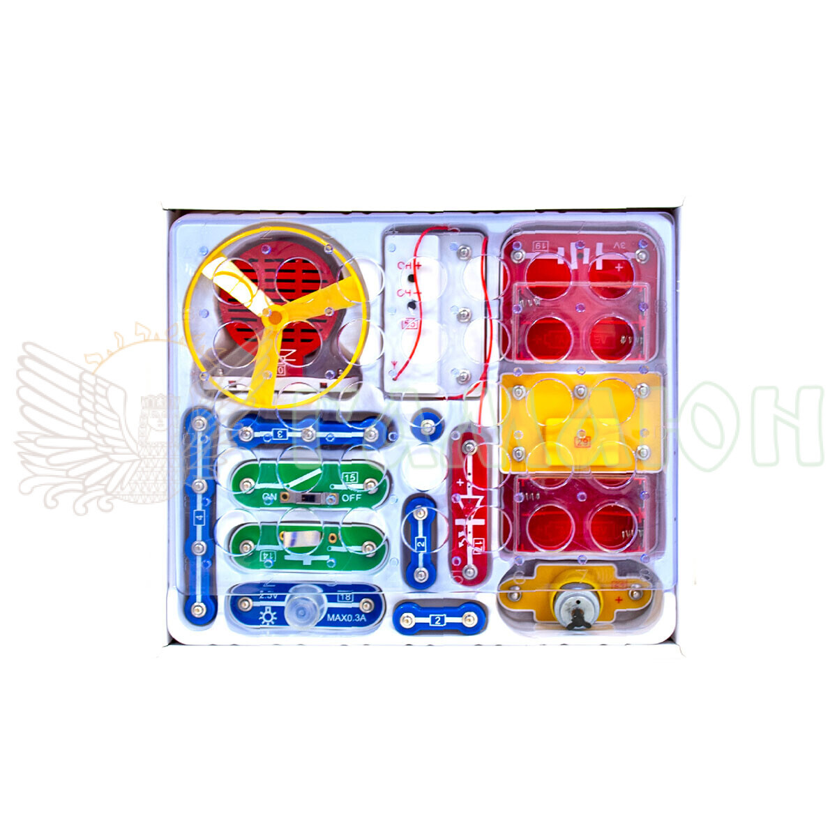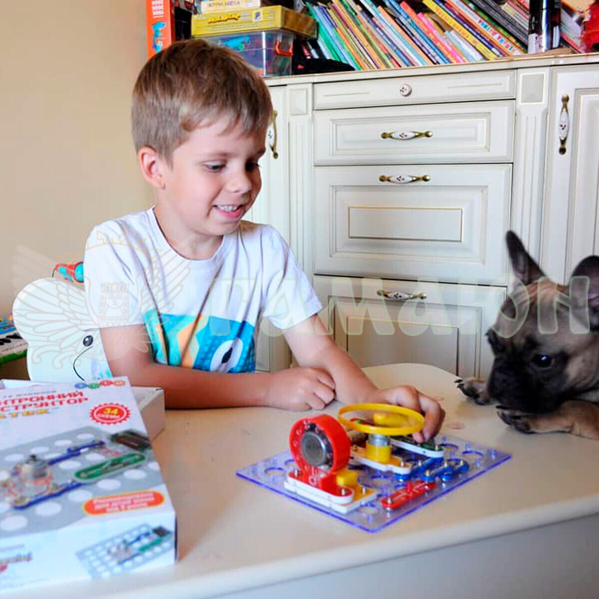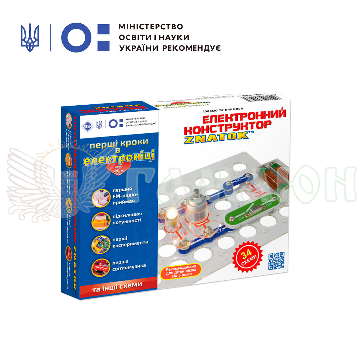 Конструктор ЗНАТОК "Перші кроки в електроніці" (34 схеми, набір С) - чудовий подарунок хлопчику 5 років, який хоче відчути себе юним інженером! Електронний конструктор дозволить дитині отримати базові знання в галузі електроніки, навчитися збирати досить складні прилади та читати електронні схеми. Оригінальний спосіб з'єднання деталей забезпечує швидкий та ефективний результат без використання паяння. Дитина зможе навіть проводити самостійні експерименти та створювати свої схеми. Електронний конструктор «Знаток» пройшов апробацію в школах та інших навчальних закладах, і в результаті отримав високу оцінку фахівців. За допомогою конструктора можна зібрати:1. Ліхтарик з лампочкою.2. Світлодіодний ліхтарик. Керована кнопкою лампочка.4. 5. Вентилятор. 6. Керований кнопкою вентилятор. Послідовне з'єднання керованої кнопкою лампочки та електродвигуна. Паралельне з'єднання лампочки та електродвигуна.8. Послідовне з'єднання батарей.9. Послідовне з'єднання світлодіода з лампочкою.10. Паралельне з'єднання електродвигуна зі світлодіодом.11. Одностороння провідність світлодіода.12. Послідовне з'єднання лампочки, світлодіода та електродвигуна.13. Паралельне з'єднання лампочки, світлодіода та електродвигуна.14. Змішане з'єднання лампочки, світлодіода та електродвигуна.15. Почергове включення лампочки та світлодіода.16. Почергове включення електродвигуна та світлодіода.17. Провідниковий зонд.18. Найпростіший телеграфний тренажер.19. Управління лампочкою двома послідовно з'єднаними ключами.20.Змішане керування двома вимикачами двох електроприладів.21. Управління електроприладами двома вимикачами окремо.22. Управління двома електроприладами за допомогою двох паралельно з'єднаних вимикачів.23. FM - Радіоприймач.24. Приймач з індикатором рівня гучності.25. Приймач, керований дотиком.І інші Конструктор складається з наступних елементів: Провід 1. Провід 2 - 4 шт. Провід 3 - 3 шт. Провід 4 - 2 шт. Кнопка. Вимикач. Червоний світлодіод. Ламповий патрон 2.5 В. Електродвигун. Підсилювач потужності. Радіоприймач FM - діапазону. Пропелер. Монтажна плата. Лампа 2.5 В. в електроніці» можна поєднувати і доповнювати один одним. Такий електронний конструктор розвиває в дитині: - дрібна моторика, - увага, логіка, - пам'ять, - математичні поняття. Для роботи конструктора необхідні 2 батарейки типу АА.