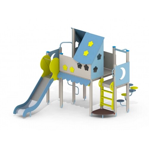 Ігровий комплекс розрахований для дітей віком 3-6 років. Складається з двох розташованих на різних рівнях майданчиків, одна з яких захищена зверху дахом. На них можна піднятися по звичайній або дугових сходах, а також радіальному мосту з канатом. Гірка обладнана зверху поперечиною, а з обох боків спуску – бортиками висотою 10 см.