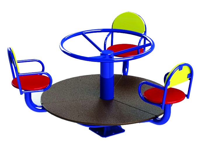 Карусель призначена для активних ігор дітей у віці від 3 до 12 років. Складається з великого круглого диска з встановленим зверху міцним металевим каркасом. До сталевих труб надійно прикріплені шість сидінь. При бажанні діти можуть кататися сидячи на них або стоячи, тримаючись за металеві ручки.
