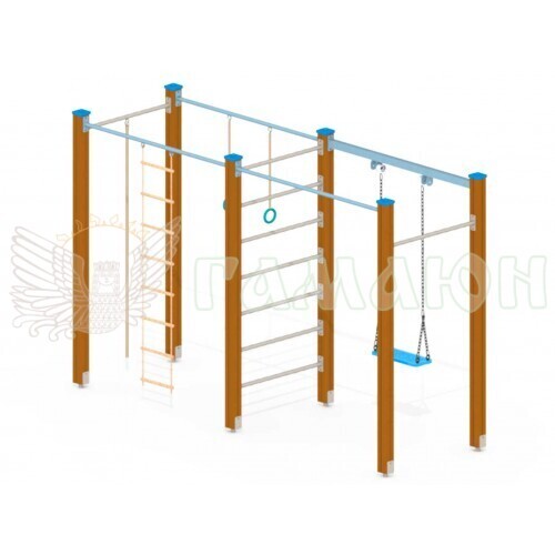 Вона складається з: Мотузкові сходи 1 шт., Перекладина 2 шт., Кільця гімнастичні 1 к-т., Канат 1 шт., Гойдалка на ланцюгах 1шт., Шведська стінка 1 к-т.