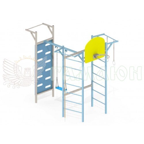 Складається з: Турнік 1 шт., Баскетбольне кільце 1 шт., Гойдалка на ланцюгах 1 шт., Стінка скелелаза 1 шт., Шведська стінка 2 к-т., Кільця гімнастичні 1 к-т., Канат 1 шт.
