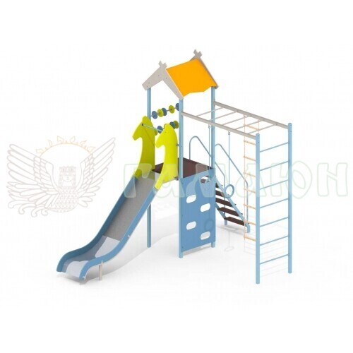Складається з: Майданчик з дахом 1 шт., Гірка 1 шт., Сходи 1 шт., Дошка з вирізами 1 шт., Рахівниця 2 шт., Рукохід 1 шт., Шведська стінка 1 шт., Мотузкові сходи 1 шт., Гімнастичні кільця 1 к-т.