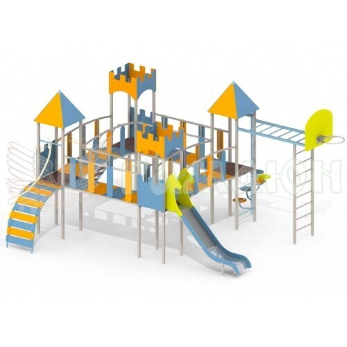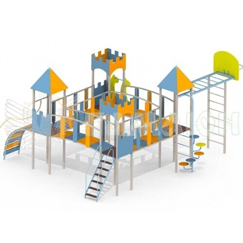 Ігровий комплекс розрахований для дітей віком 3-6 років. Зовні ігровий комплекс нагадує замок квадратної форми з розташованими по кутах майданчиками. Вони з'єднані між собою містками. Також є радіальний міст з канатом, рукохід і шведські сходи, у верхній частині якої прикріплено баскетбольне кільце. З одного з майданчиків можна спуститися з гірки, спуск якої убезпечили за допомогою бортиків висотою 10 см. Також безпеку забезпечують поперечини, розташовані на всіх майданчиках.