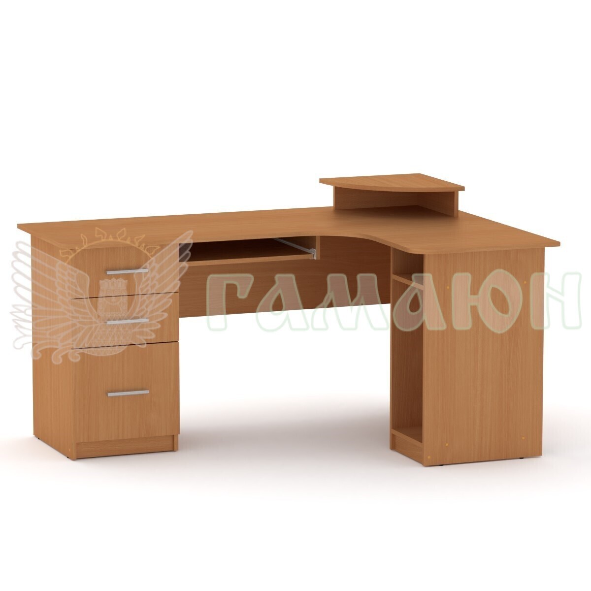 Функціональний кутовий стіл, який можна використовувати як вдома, так і в офісі. Він має висувну полицю під клавіатуру, що забезпечує комфортну роботу, а також підставку під монітор. Для зберігання канцелярії та паперів призначені три висувні ящики та полиця над системним блоком.