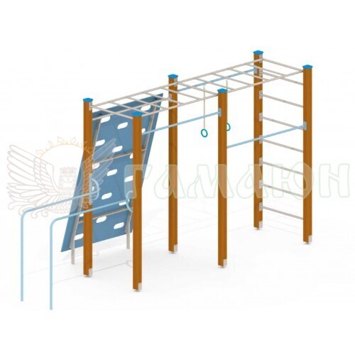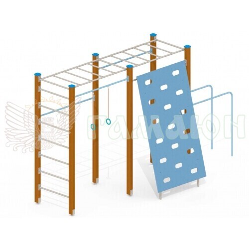 Складається з: Рукохід 1 шт., Перекладина 2 шт., Кільця гімнастичні 1 к-т., Бруси 1 шт., Стінка скелелаза 1 шт., Шведська стінка 1 к-т.