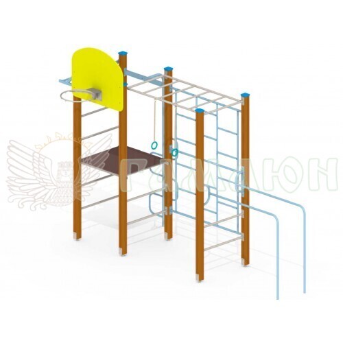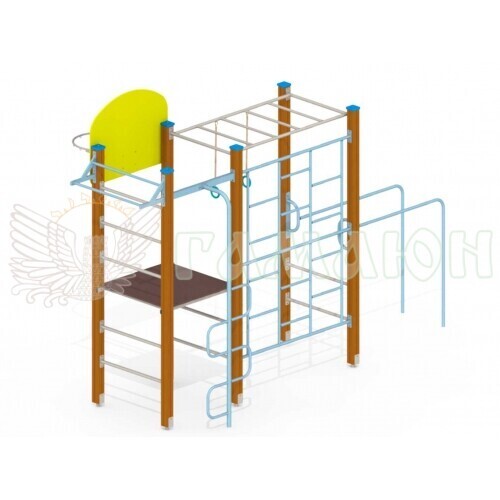 Складається з: Рукохід 1 шт., Перекладина 2 шт., Майданчик 1 шт., Бруси 1 шт., Стінка скелелаза 1 шт., Шведська стінка 1 к-т., Баскетбольне кільце 1 шт., Турнік 1 шт.