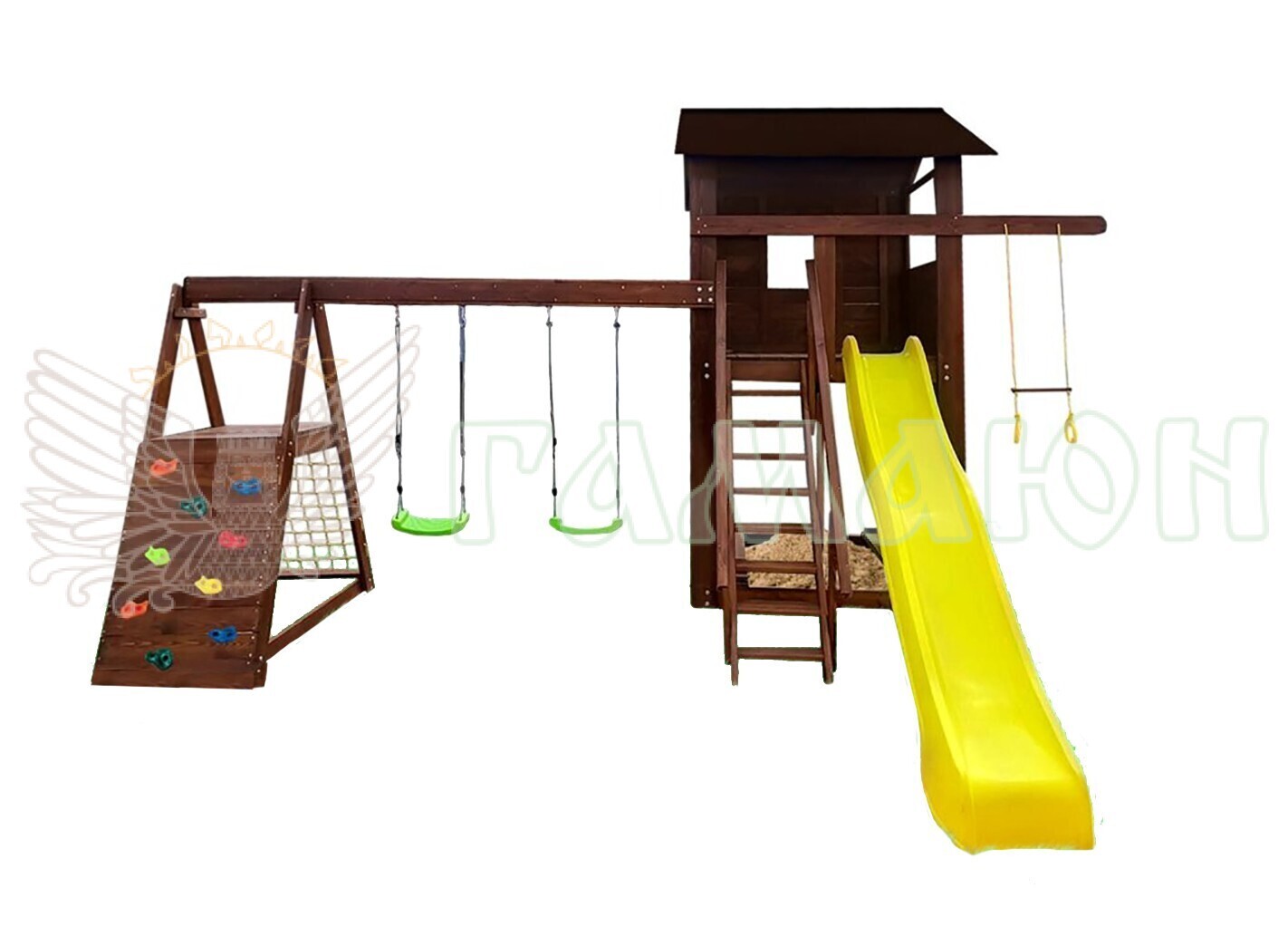 Ігровий будиночок, Пісочниця, Сходи з поручнями, Скелелазка - 2шт., Гірка пластикова - 1шт., Гойдалки 2 пластикові, Кільця - 1 пара, Канат - 1шт.