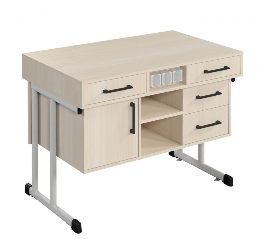 Стіл обладнано тумбою з чотирма шухлядами та відкритою нішею з стаціонарною нижньою полицею. Всі шухляди змонтовано на металевих роликових напрямних. Спереду стіл закритий екраном.