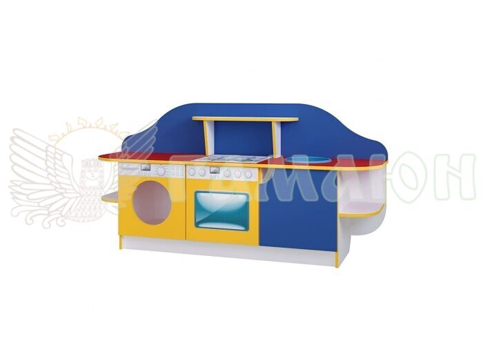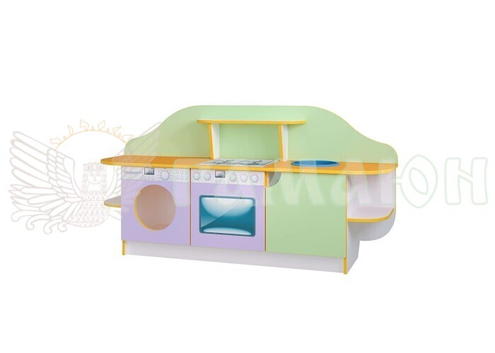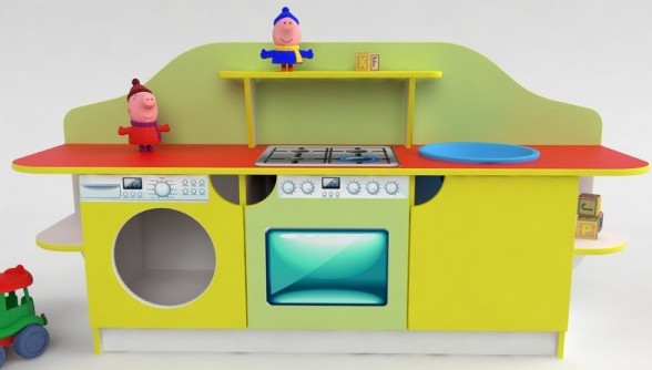 Ігрові меблі призначені для обладнання дитячого садка. Комплект є імпровізованою кухнею з іграшковою мийкою, пічкою і пральною машиною. Меблі виготовлені з екологічно чистої ДСП товщиною 16 мм класу Е1, призначеної для виготовлення дитячих меблів. На торці нанесена кромка ПВХ товщиною 0,6 мм при високотемпературному режимі на кромкооблицювальному верстаті, що забезпечує максимальний захист країв від вологи та механічних пошкоджень. Базовий колір кромки – жовтий.
