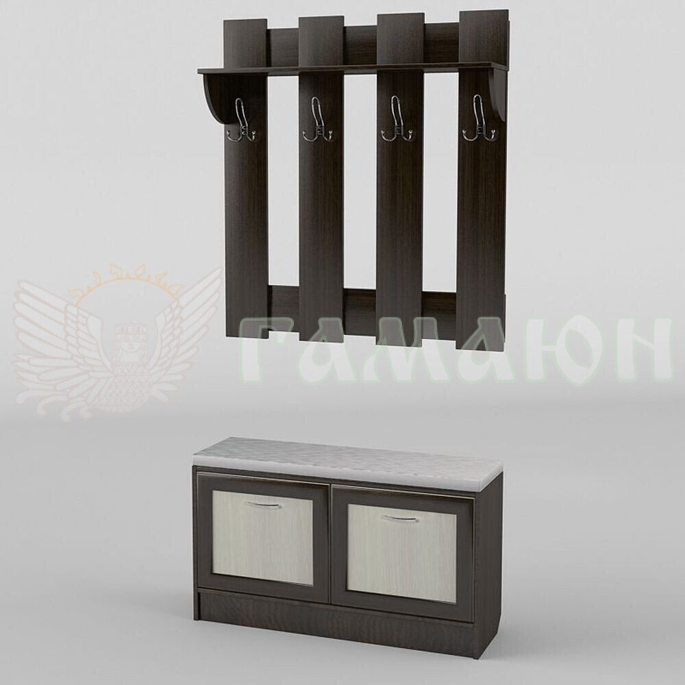 Передпокій-4 укомплектований тумбою для взуття з м'яким сидінням, відкритою вішалкою на три гачки, горизонтальною полицею.