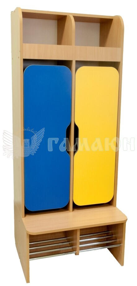 Фасад оклеєний крайковою стрічкою ПВХ 1 мм; інші частини шафи - ПВХ 0,5 мм. Гачки для меблів хромовані малі. Кольорові дверцята з вирізом. Заокруглені кути. Труба хромована d=16 мм.
