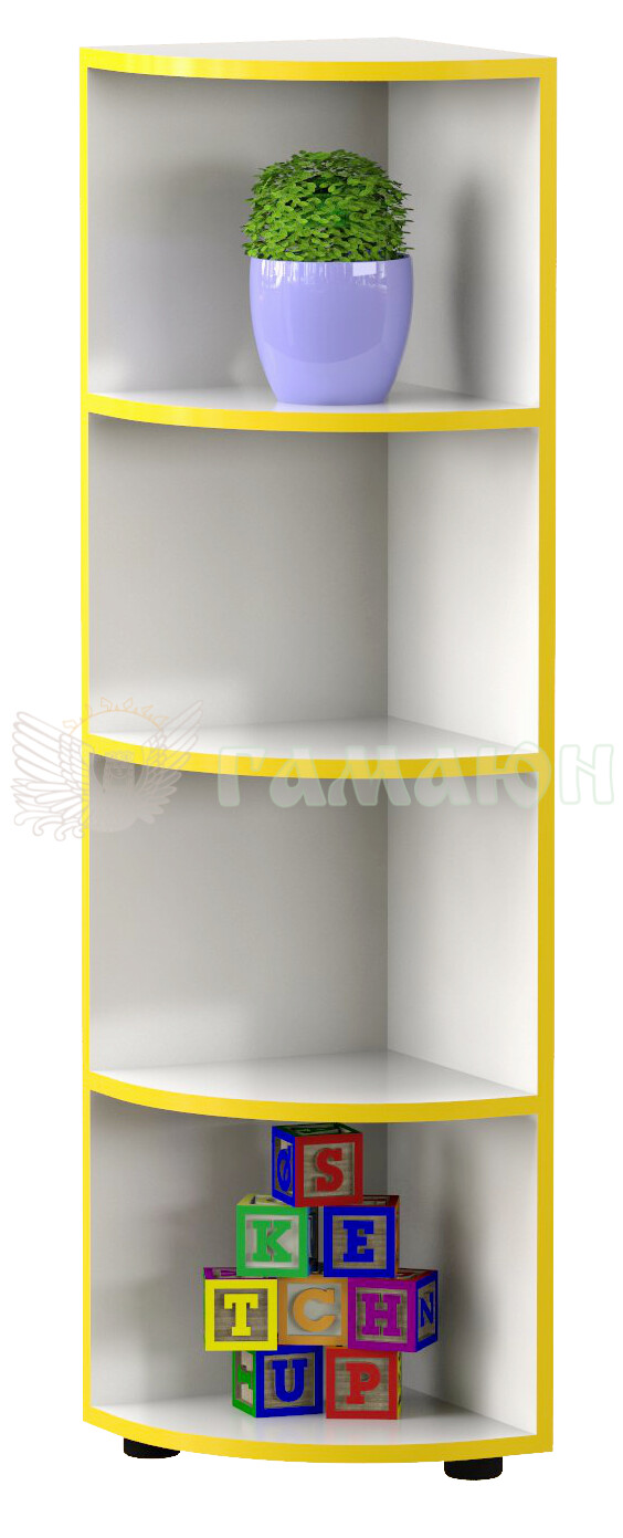 Компактний кутовий сегмент для шафи складається з чотирьох полиць, які спираються на опори з пластику, що регулюються. Як і інші меблі кутової конструкції, цей сегмент дозволяє більш повно й раціонально використовувати простір. Всі кути цього виробу, з яким можуть контактувати діти або педагоги, заокруглені, що дозволяє уникнути пошкоджень одягу, подряпин або ударів.