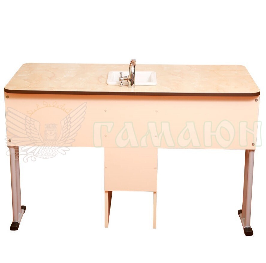 Опис виробу: Стіл призначений для виконання хімічних експериментів, демонстрацій і практичних занять в умовах шкільних лабораторій. Оснащення мийкою зі змішувачем забезпечує зручність роботи з реагентами та лабораторним посудом. Конструкція передбачає наявність відкритої полиці та переднього екрану для ергономічного зберігання допоміжного приладдя і візуального закриття простору під стільницею. Виріб зібрано на зварному металевому каркасі, що гарантує міцність і стійкість при тривалій експлуатації.