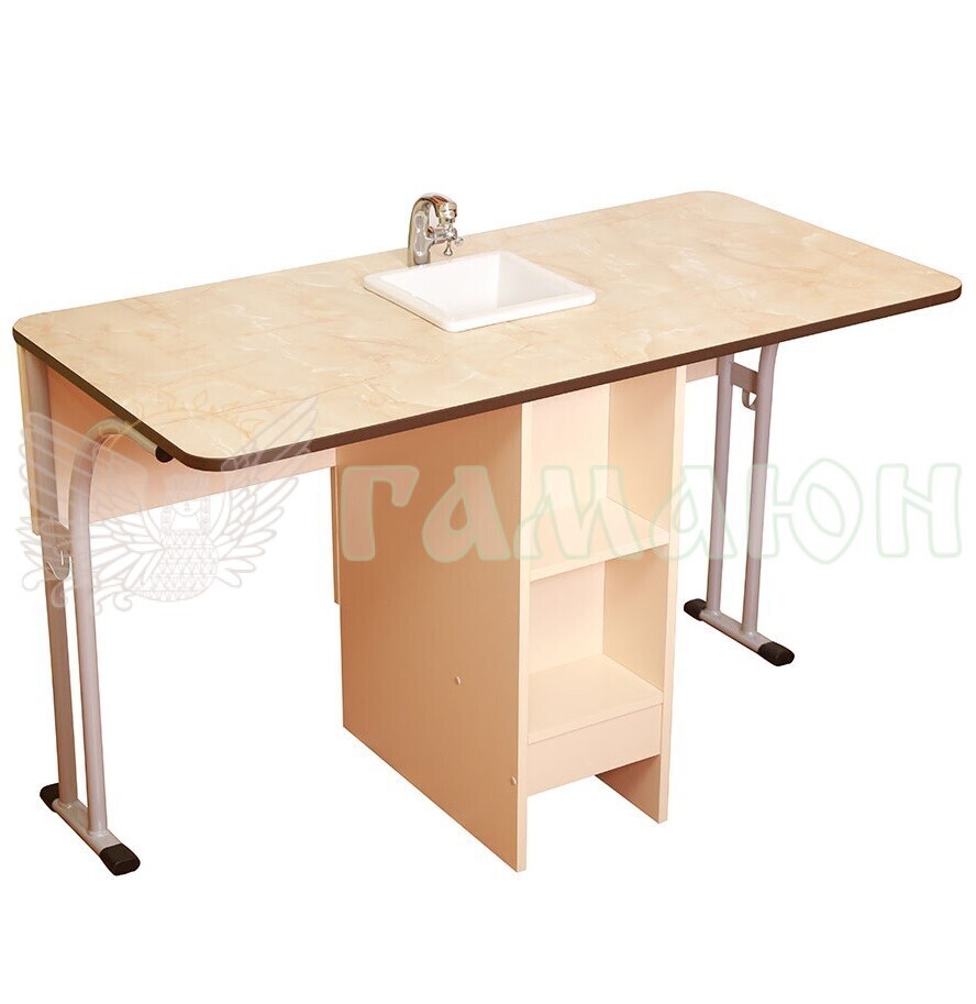Технічні характеристики: Габаритні розміри стільниці — 1200 × 600 мм, висота столу — 760 мм. Стільниця має вмонтовану мийку зі змішувачем, оздоблена хімостійким пластиком товщиною не менше 0,6 мм. Торці стільниці — з ПВХ крайкою 2 мм. Передній екран і полиця під стільницею виготовляються з ДСП товщиною не менше 16 мм, з крайками ПВХ товщиною 0,45–0,50 мм. Усі елементи на деревинній основі мають клас емісії формальдегіду Е1. Каркас виготовлений із круглої сталевої труби діаметром 27 мм, товщиною 1,5 мм, з покриттям порошковою емаллю. Верхні торці каркасу та опори оснащені поліетиленовими заглушками, що фіксуються з натягом.