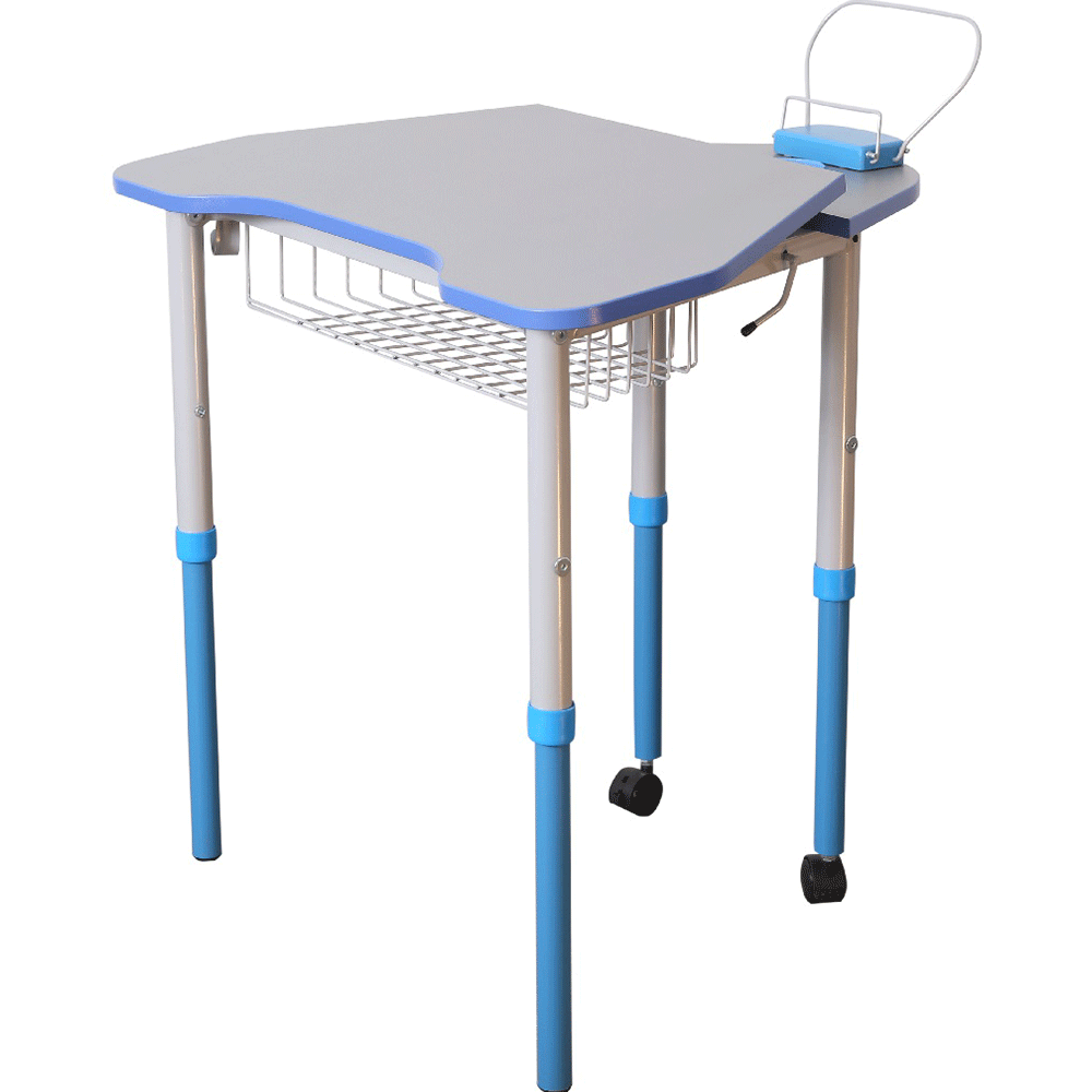 Каркас стола виконаний з труб 25х25х1,2; ϕ.27х1,2 та ϕ.32х1,2 для зростових груп 3-5 або 4-6. Стіл має 4 ноги-опори – дві передні оснащені роликами, за допомогою яких стіл може легко переміщатися по приміщенню. Регулювання стола по висоті здійснюється за допомогою гвинтових стяжок та рухомих, по відношенню одна до одної, деталей каркасу. Рухомі деталі каркасу з’єднані через пластикову втулку. На каркасі стола встановлений механізм підйому стільниці, що дозволяє їй займати два положення 0⁰ та 8⁰.