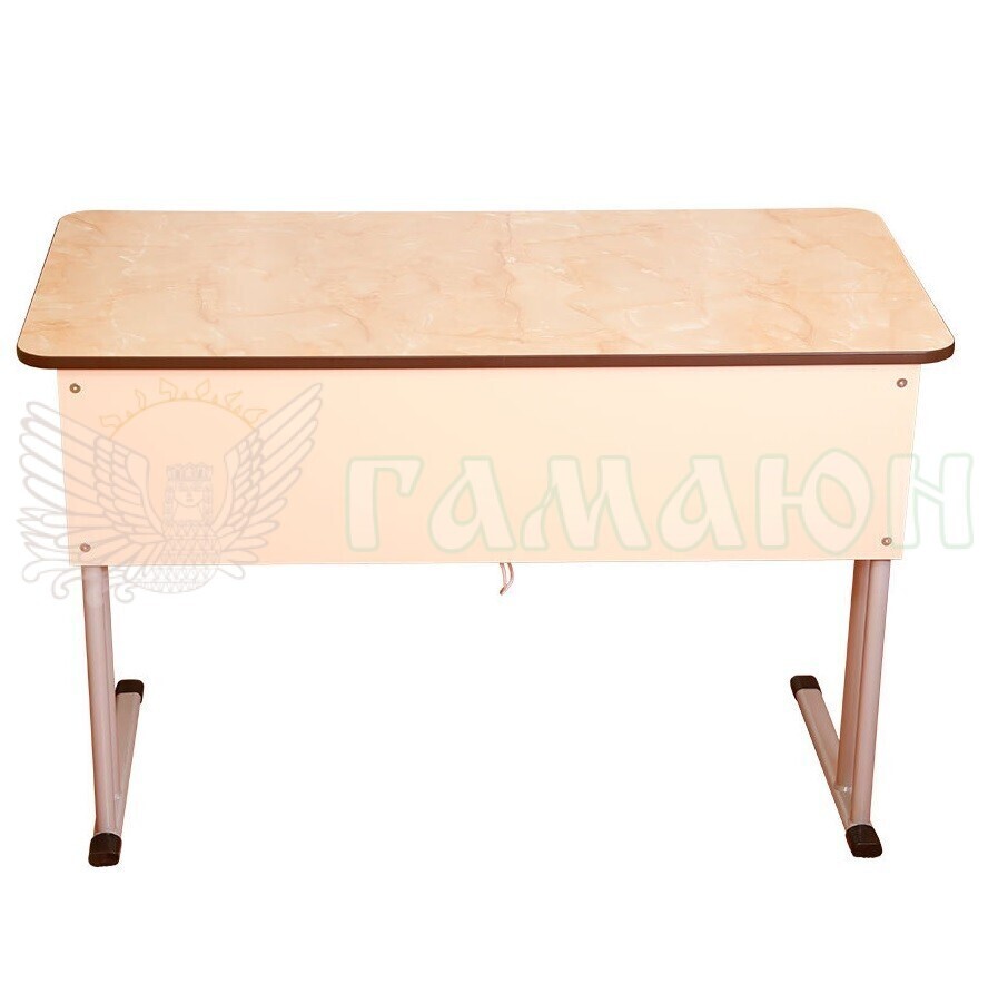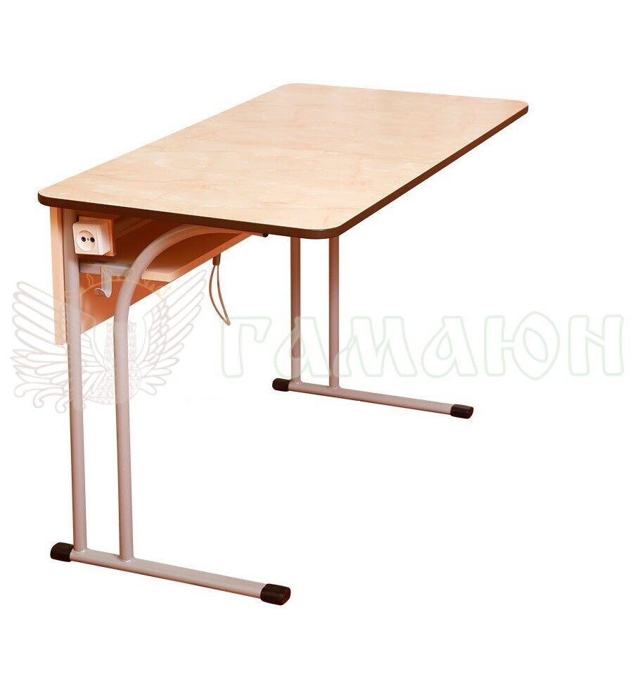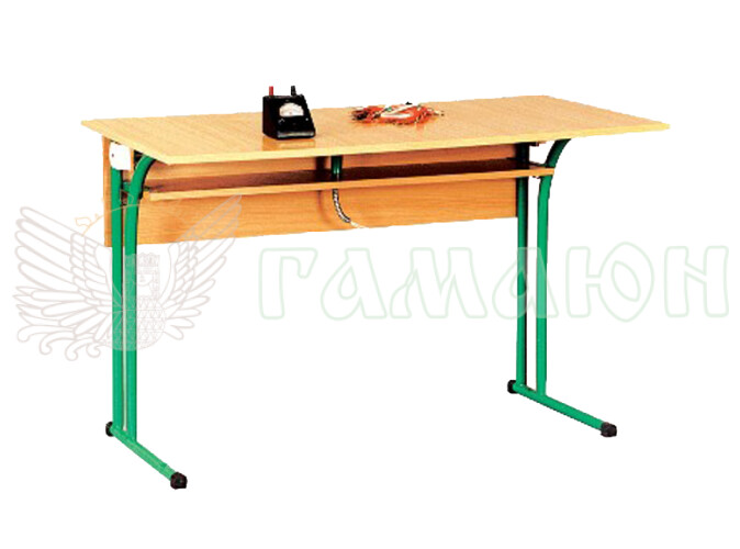 Металевий каркас столу виготовляється з круглої сталевої труби діаметром 27 мм товщиною 1,5 мм. Покриття – зносостійка порошкова емаль. Стіл спеціально оснащений двома електричними розетками для фізичних експериментів. Профільна рама забезпечує скрите прокладання силового кабелю для підключення розеток.