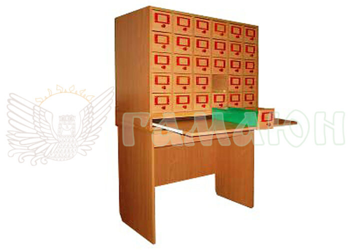 Складається з однієї секції на 30 шухляд з висувною полицею і стола-підставки. Фасади, шухляди, полку і корпус шафи і столу виготовлені з ламінованого ДСП світлий бук товщиною 16 мм, торці обклеєні протиударною кромкою ПВХ 0,5-2,0 мм. Висувна полиця під клавіатуру змонтована на роликових напрямних.