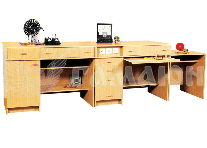 Всі елементи столу виготовляються з ДСП кольору “бук” товщиною 16 мм класу емісії Е1. Під стільницею розміщено шухляду та панель з трьома електричними розетками. Стіл обладнано тумбою з чотирма шухлядами та відкритою нішею з стаціонарною нижньою полицею та висувною верхньою полицею. Всі шухляди та полиця змонтовані на металевих роликових направляючих. Спереду стіл закритий екраном.