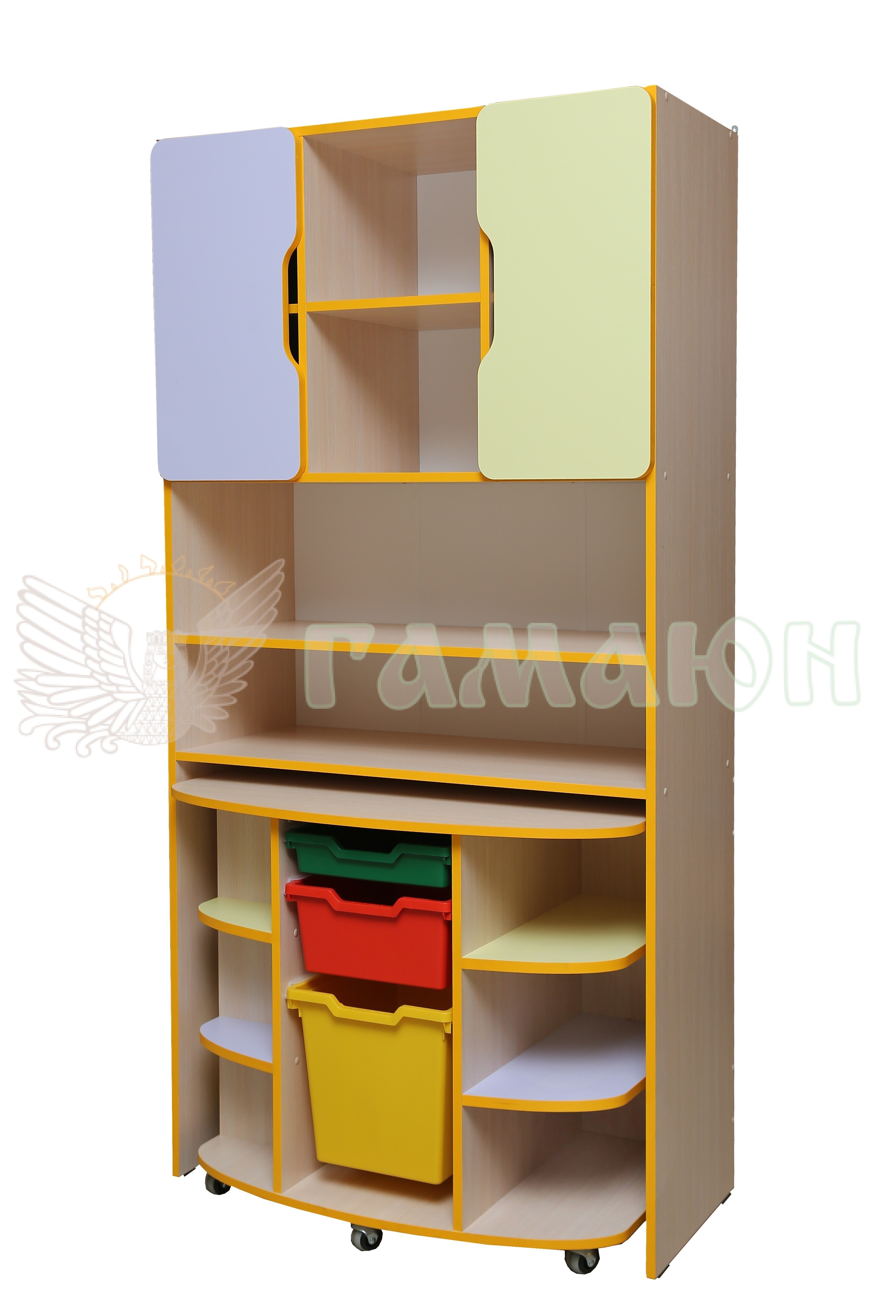 Зверху елемент обладнаний відкритими та закритими полицям для зберігання дидактичного матеріалу, книг, папок, особистих речей дітей. Знизу встановлюється мобільний елемент «Осередок творчості учня».