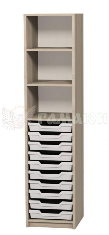 Технічні характеристики: Габаритні розміри складають 360 × 405 × 2115 мм. Конструкція включає три полиці з можливістю регулювання по висоті. Пенал комплектується десятьма пластиковими висувними лотками сірого кольору, при цьому можливе використання двох різних типорозмірів лотків. Корпус виготовляється з ламінованої ДСП товщиною 18 мм з облицюванням крайкою ПВХ товщиною 0,5 мм. Задня стінка — ХДФ білого кольору, одностороннього ламінування, товщиною 2,5 мм. У нижній частині конструкція оснащена металевими регульованими опорами з діапазоном налаштування до 30 мм для встановлення на нерівну поверхню.