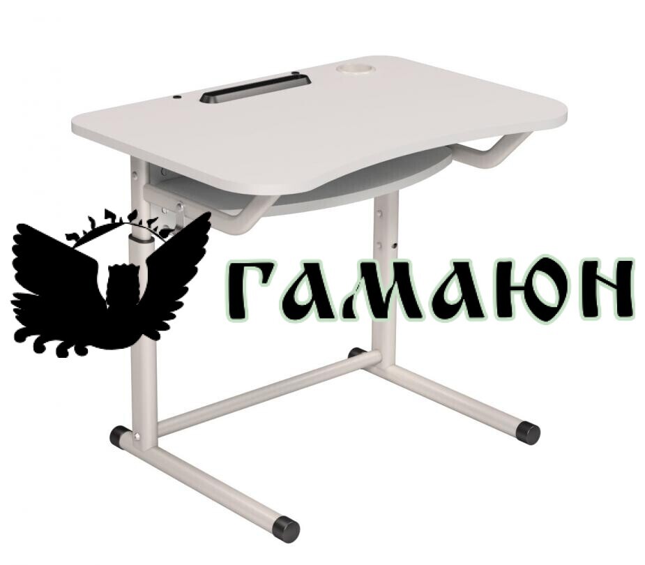Стіл складається зі стільниці ергономічної форми (заокруглені кути з 4-х сторін) та екрану з полицею між металевими каркасами. На боковій стійці каркасу закріплений гачок. Стільниця містить отвір для стакану з канцелярським приладдям та пенал, а також має антисколіозний виріз.