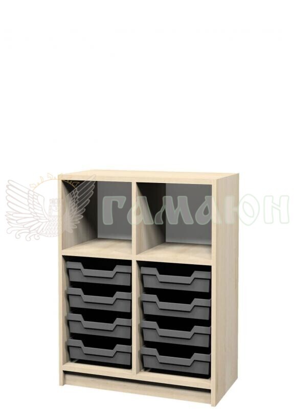 Тумба відкрита з лотками — це функціональний елемент для швидкого доступу до навчального приладдя, що поєднує чотири відкриті секції зі змінними пластиковими контейнерами. Габаритні розміри виробу становлять 702 × 370 × 780 мм, що дозволяє компактне розміщення навіть у невеликих приміщеннях. Конструкція тумби включає чотири відкриті полиці, які комплектуються вісьмома висувними лотками з пластику, встановленими на напрямляючих. Це рішення дозволяє ефективно впорядковувати дрібне навчальне обладнання, канцелярію або матеріали для творчості. Корпус виготовляється з ламінованої ДСП товщиною 18 мм, торці деталей облицьовані ПВХ-крайкою товщиною 0,5 мм. Задня стінка — з білої ХДФ 2,5 мм. Для стабільного встановлення тумба обладнана регульованими по висоті металевими опорами (0–30 мм). Колір корпусу — бук артизан перламутровий — додає виробу теплої і водночас нейтральної естетики, що легко інтегрується в будь-яке освітнє середовище..
