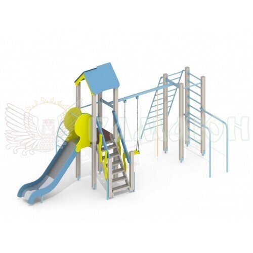 Складається з: Майданчики з дахом 1 шт., Гірка 1 шт., Сходи 1 шт., Дугові сходи 1 шт., Шведська стінка 1 шт., Канат - 1 шт., Турнік 1 шт., Гойдалки одинарні 1 шт.