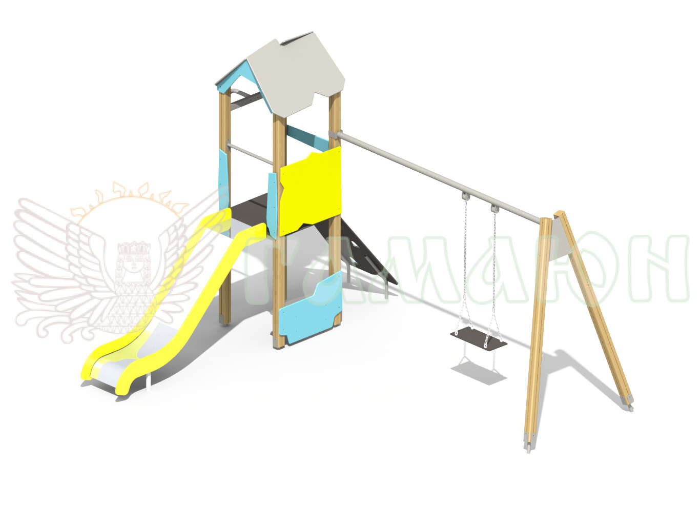 Складається з: Майданчик з дахом 1 шт., Гірка 1 шт., Сходи 1 шт., Гойдалки 1 шт.